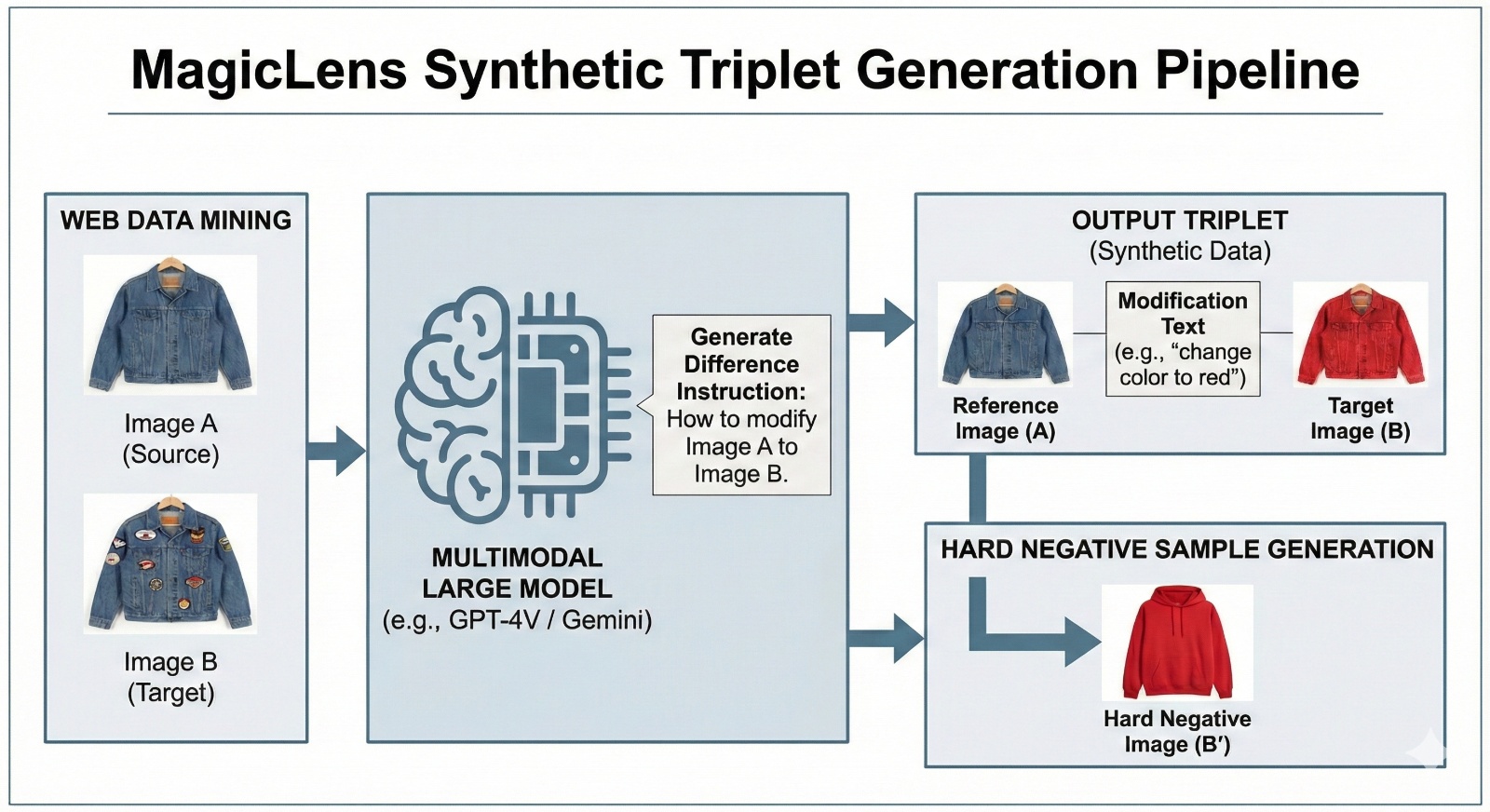 与LinCIR的轻量化路线不同,Google DeepMind的MagicLens坚持“数据驱动”。MagicLens利用多模态大模型(如Gemini,GPT-4V)挖掘网页中自然共现的图像对(如同一商品的不同视角、同一系列的款式),并生成描述差异的指令,构建了包含3670万个三元组的MagicLens-Data。在如此庞大的数据上训练的MagicLens模型,在理解复杂空间关系和逻辑推理上达到了较高的性能水平。在电商与大规模应用场景中,利用弱监督或自动构建的多模态数据进行模型训练,被认为是缓解人工标注成本的重要工程路径[8]。