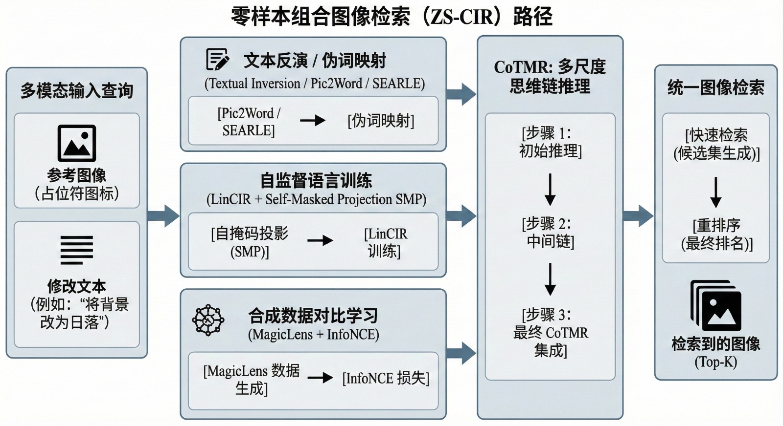 2. 实践层面,LinCIR以极简架构实现了工业级实时检索能力,在训练成本与性能之间取得较好平衡,是当前性价比突出的落地方案;MagicLens和CoTMR则展示了合成数据与逻辑推理在性能突破中的潜力,为技术演进提供了重要参考。