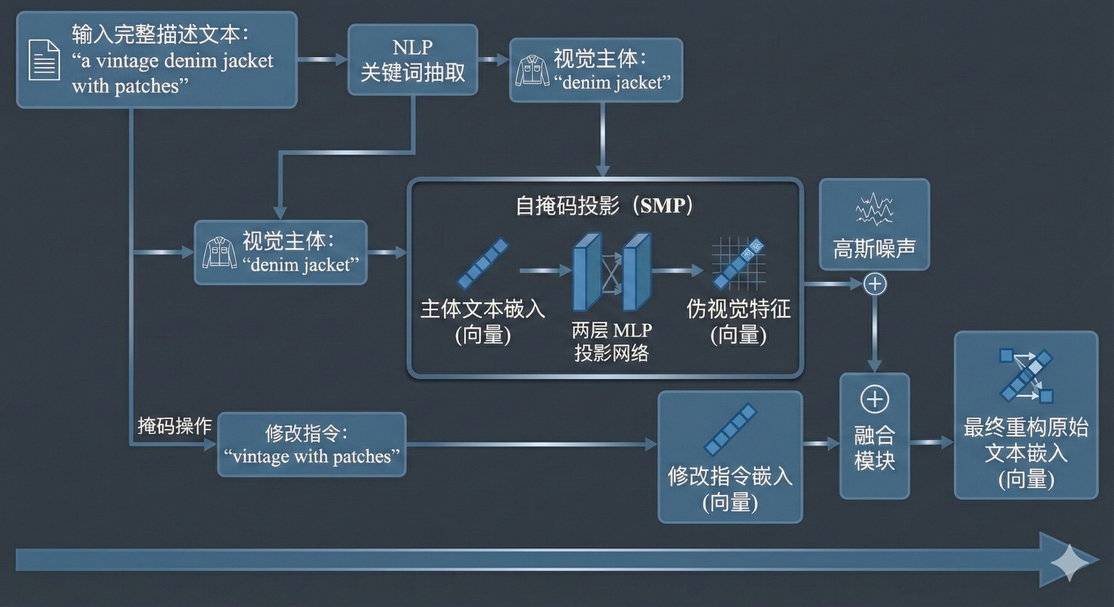 图2形象展示了自掩码投影(Self-Masking Projection, SMP)机制的整体流程,包括关键词抽取、文本掩码、伪视觉特征构建以及文本语义重构。