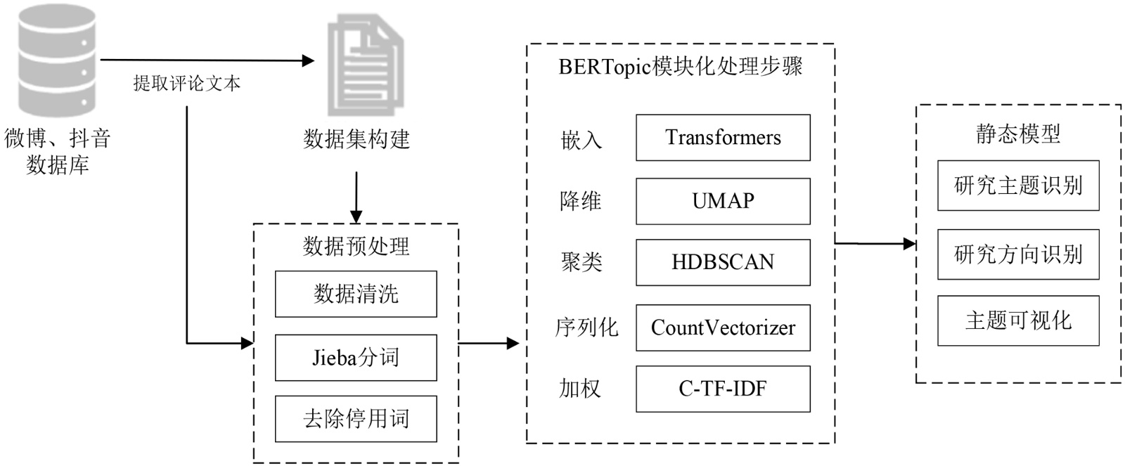 BERTopic是一种新颖的语义分析工具,它将预训练模型BERT与主题建模相结合,是Grootendorst在2022年提出的一个主题建模方法,在各个领域的主题建模中取得了良好的主题识别[13]。与LDA相比,BERTopic的核心优势在于它能够更有效地处理文本,在保留上下文语义信息的同时,在主题词的深度、专业性和词关系的清晰度方面表现出卓越的性能。该模型首先使用BERT构建文档嵌入,UMAP进行降维,HDBSCAN算法进行分层和密度聚类,最后使用c-TF-IDF提取主题词[14]。BERTopic进行主题建模具体流程及方法如图2所示。