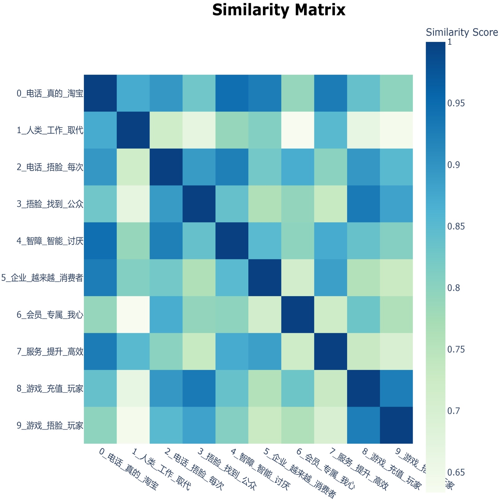 在预设参数条件下,BERTopic模型识别出10个潜在主题(Topic 0~Topic 9)。为消除冗余主题并贴合主题结构,通过余弦相似度计算主题间的关联矩阵,并借助热力图(如图3所示)直观呈现各主题间的关联程度,将相似度高于0.9的主题标记为潜在合并对象,由两位研究人员独立审查这些主题的关键词与代表性评论,依据“是否归属于同一行为现实主义维度”进行判断。在此基础上,将Topic 0、Topic 5与Topic 7合并,Topic 6、Topic 8与Topic 9合并,最终凝练出6个行为现实主义相关的核心主题。为了更直观地展现聚类效果,本研究采用了降至二维的向量来表征每条评论文本。在主题聚类过程中观察到的高密度簇,可视为电商平台智能客服的关注热点。主题和评论文本之间的关系如图4所示。