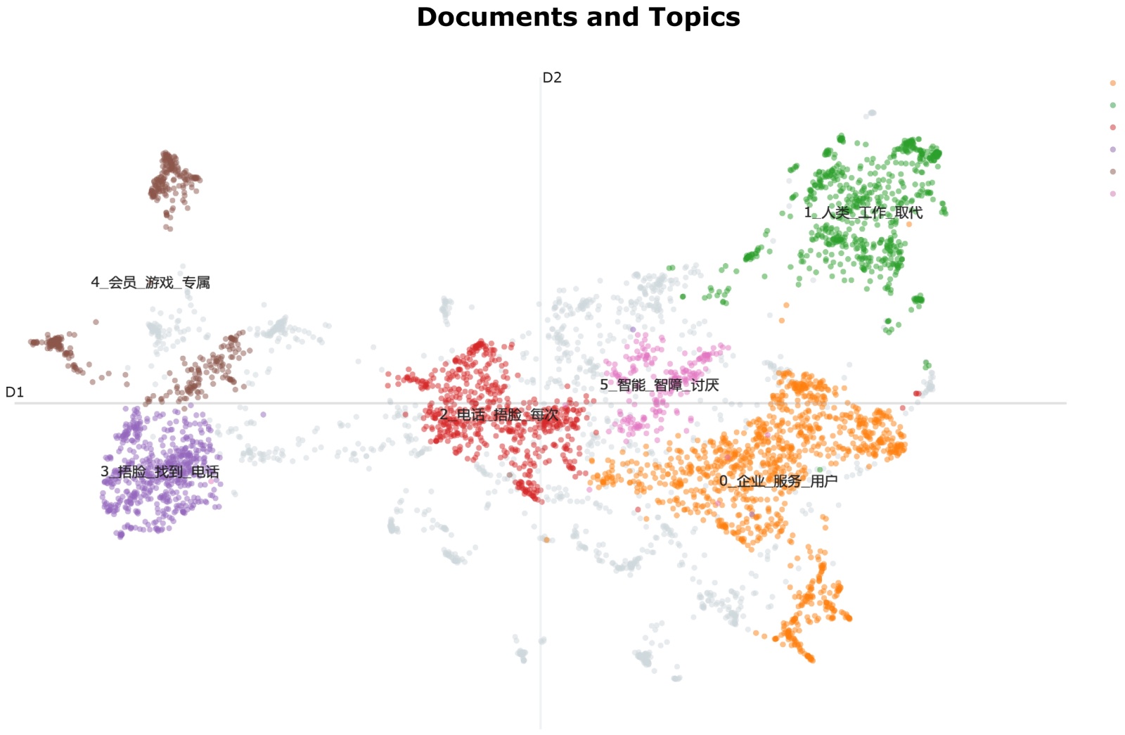 图4中每个点代表一条评论,点的颜色表示特定文档所属的主题,大多数主题簇彼此之间显著分离,模型具备良好的主题区分能力。通过分析各主题的关键词及其对应文本内容,确定各主题代表的电商平台智能客服属性。主题0为人机协同,主题1为职业替代,主题2为响应速度,主题3为服务可及性,主题4为问题解决成本,主题5为智能水平。
