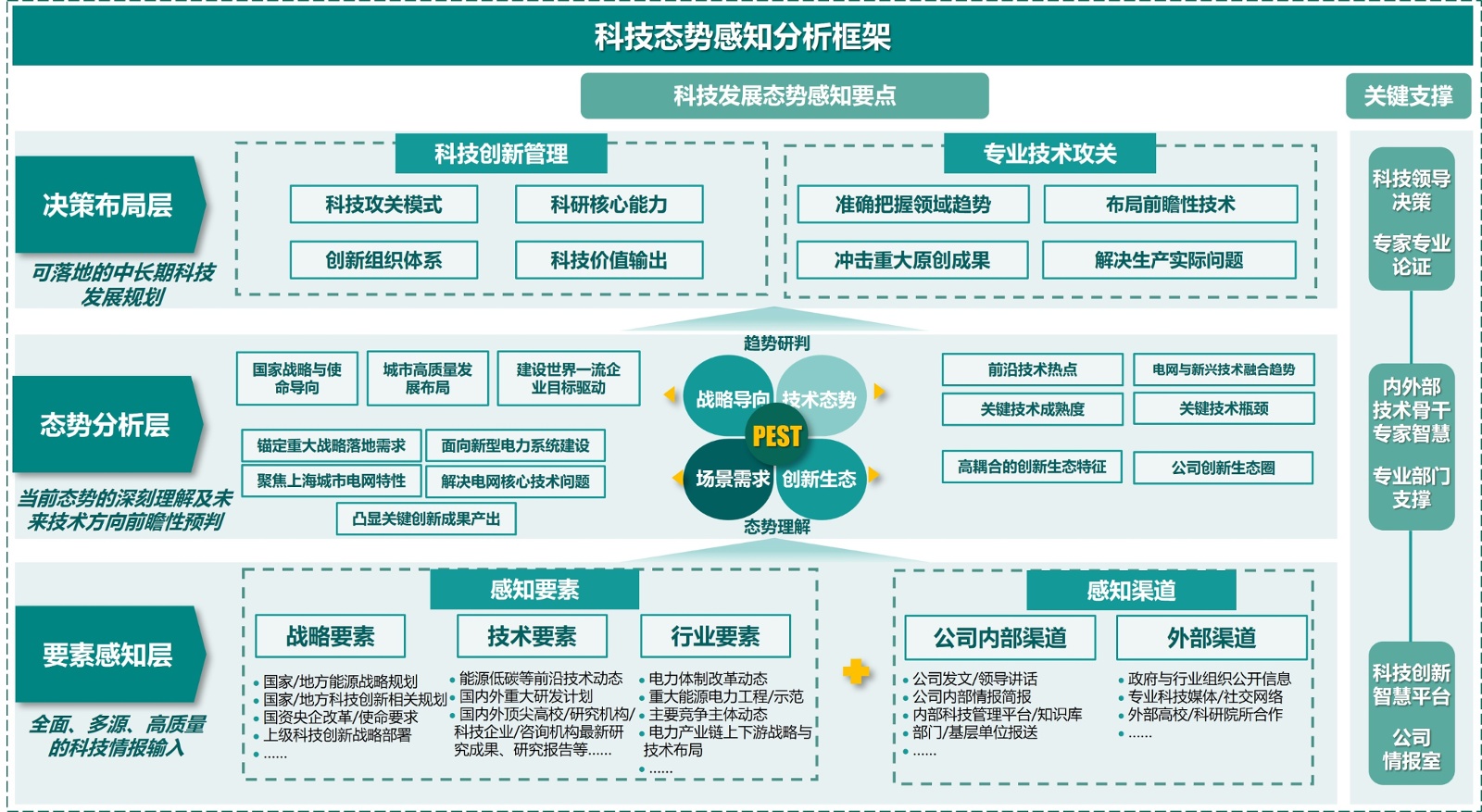 决策布局层作为科技态势感知成效向科技创新管理和技术研发攻关推进的核心枢纽,需以科技领导的顶层决策为核心把控方向,同时依托内外部能源电力领域专家、资深管理人员开展多轮可行性论证、风险评估及方案优化提供专业支撑,确保决策与科技发展态势、自身实际需求深度契合。