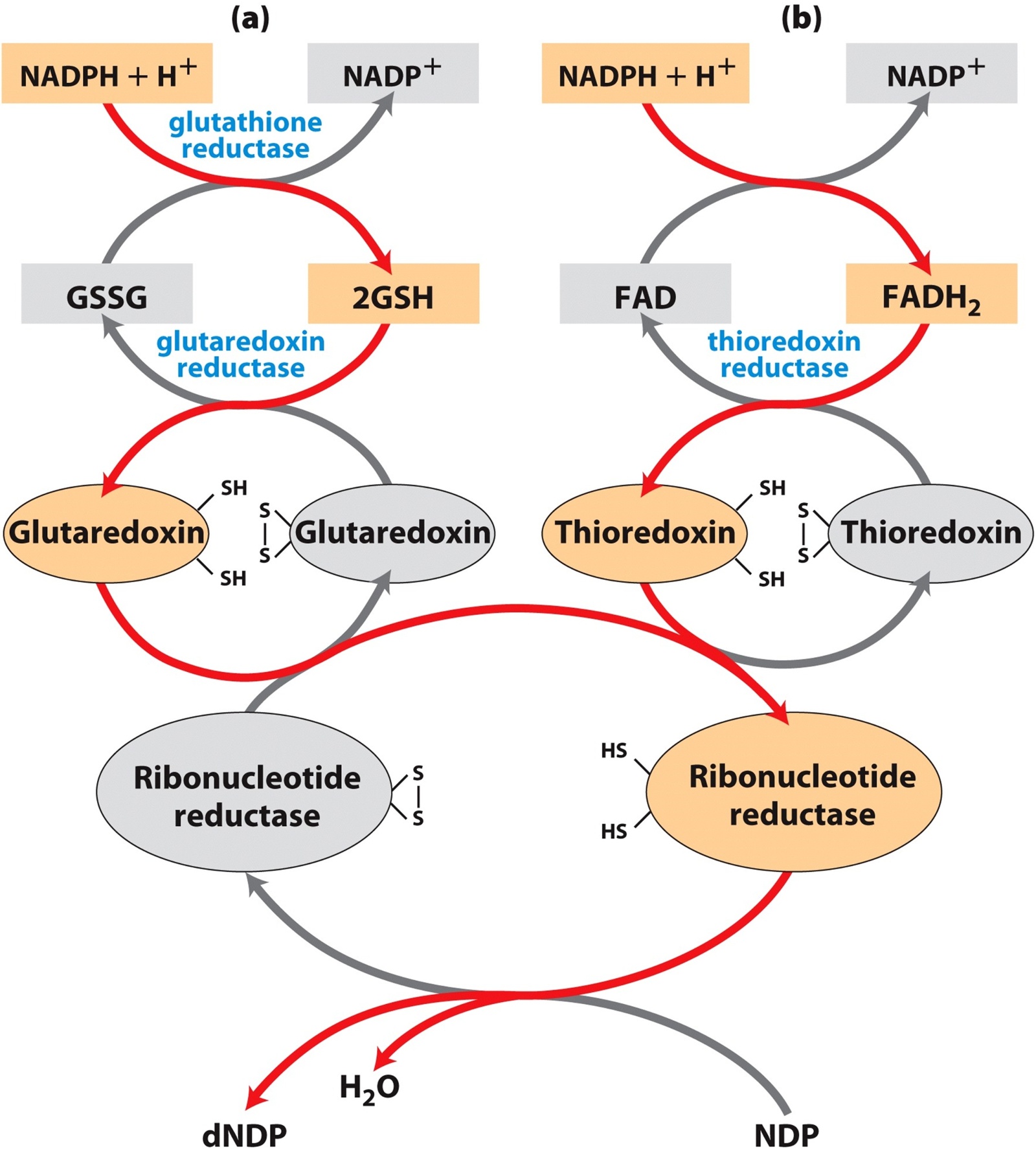 (2) 脱氧核苷酸和胸苷酸的合成,都需要NADPH提供还原力。二磷酸核苷还原酶催化核苷酸变成脱氧核苷酸,需要硫氧还蛋白(谷氧还蛋白)作为辅助因子提供还原力H,与戊糖结构上2’-氧结合。硫氧还蛋白(谷氧还蛋白)自身两个半胱氨酸巯基被氧化,最后由NADPH提供氢再被还原。二磷酸核苷还原酶的催化机制如图2,谷胱甘肽、硫氧还蛋白(谷氧还蛋白)及其还原酶、二磷酸核苷还原酶都涉及半胱氨酸。
