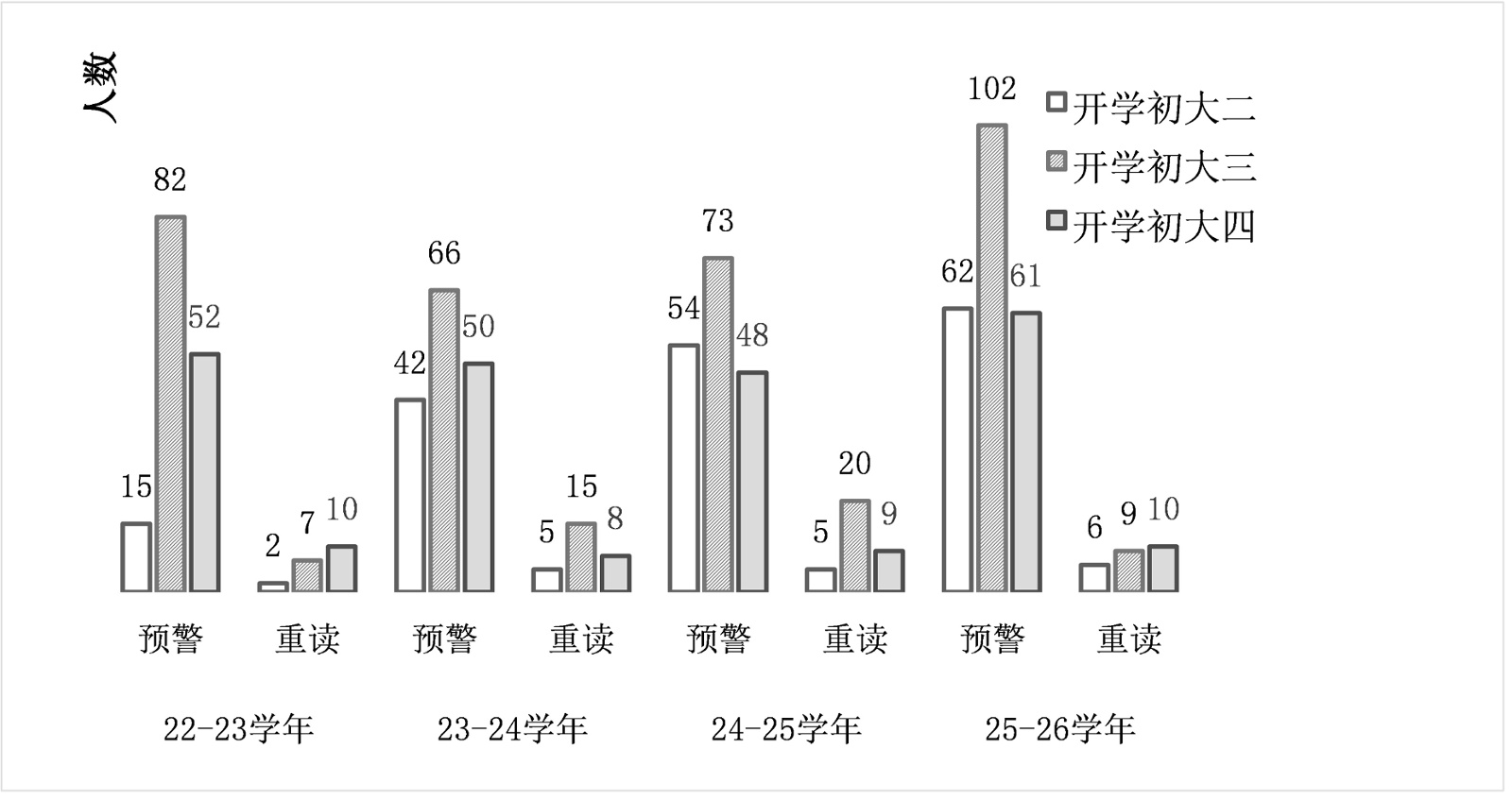在年级分布方面,本研究对四个学年内留级预警、留级重读的学生人数进行了统计。由图1可知,三个年级的预警人数从高到低依次为大三开学初 > 大四开学初 > 大二开学初。究其原因,从课程分布方面分析,大一新生入学时,所修课程较为基础,部分课程内容与高中知识存在衔接,学业压力相对较小;进入第二学年后,修业课程的难度与数量显著增加,主要进行专业核心课程的学习,挂科率升高;进入第三学年,其课程设置更侧重于实践应用,考核方式较为灵活,挂科率有所降低。然而,由于此时课业基本结束,部分学业表现不佳的学生累计挂科课程较多,因此大四开学初的预警人数相比大二开学初要高出许多。