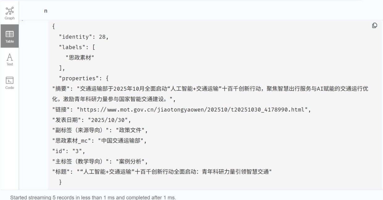 使用neo4j图数据库实现《交通大数据与人工智能》课程思政知识图谱的可视化见图5。