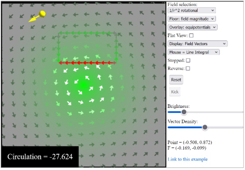 本研究采用迭代设计,在两期教学循环(第一期:2024年秋;第二期:2025年秋)中持续优化。课程理论讲授38学时,实践教学10学时,围绕矢量场、静电磁场、波动、电磁波反射透射、波导模式等核心概念,设计了5个基于Falstad网站的交互仿真模块,部分模块如图1所示。教学流程强调“引导–探索–协作–分享”:教师简要演示后,学生以小组形式操作仿真,调整参数、观察现象,并讨论仿真结果与理论知识的联系,最后进行小组展示与集体研讨。以图1(d)所示模块为例,学生在教师引导后,自行选择矢量场环路积分的探索,通过在场区中划设不同的积分环路,互动式仿真程序可即时给出积分结果,便于学生与理论计算结果进行比对。同时,改变积分环路的位置,可即时观察到积分结果的不同,便于学生深入理解矢量场的环路积分。学生通过一系列操作、观察、总结后,开展小组展示与集体讨论,进一步深化对所学内容的理解。
