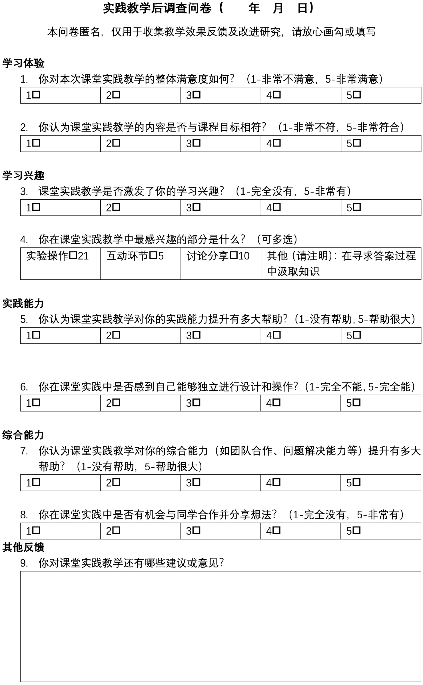 本研究采用问卷调查法,共进行三轮数据收集:在第一期(30人教学班)的首末两次实践环节结束后和在第二期(12人教学班)首次实践环节结束后发放匿名问卷。共回收有效问卷66份(第1次26;第2次28;第3次12)。问卷采用了经典的“背景–过程–结果–建议”框架,包含9个问题,其中7个为Likert 5点量表题[11] [12],系统测量教学效果的不同维度;1个为多选题,识别最有效的教学活动和学生偏好;1个为开放性问题,收集个性化、深层次的反馈,为量化数据提供背景和解释。调查问卷样卷如图2所示,调查结果汇总如表1所示,其中Q1~Q8的3个数字分别对应3次调查的学生反馈统计结果;Q9的每一栏对应收到的开放性建议。