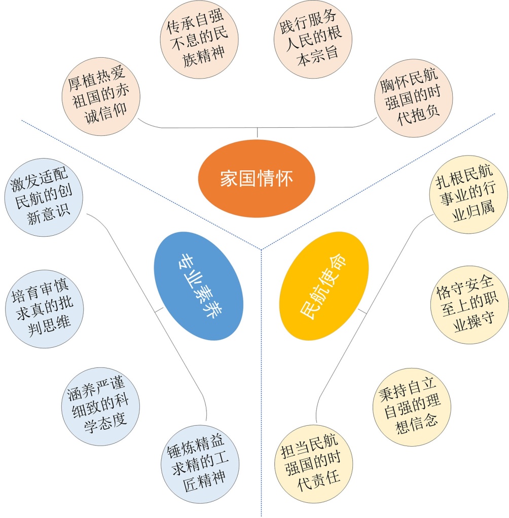 本专业课程思政体系以“家国情怀为底色、民航使命为导向、专业素养为支撑”,三者围绕“民航电子信息人才”的培养定位形成联动: