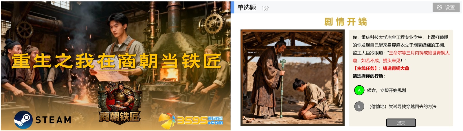 针对传统课堂中“Z世代”学生的参与度不足问题,我们创新采用“AI + 雨课堂”技术架构,开发了多个沉浸式游戏化教学系统。如在冶金简史章节中课程导入设置了《重生之我在商朝当铁匠》游戏(如图2所示)。该教学设计八个核心关卡,学生在完成“铸造后母戊鼎”的任务中,需要身临其境般地完成矿源识别、燃料选择、筑炉设计、合金配比等系列决策。这种设计刻意模拟了古代工匠面临的真实挑战,每个选择都直接关联不同的教学反馈,形成了强烈的参与激励。在这种情境化学习中,抽象的冶金原理深度内化为解决实际问题的关键知识,实现了从“教师中心”向“学生中心”的教学模式转变,有效培养了学生的工程思维和决策能力。