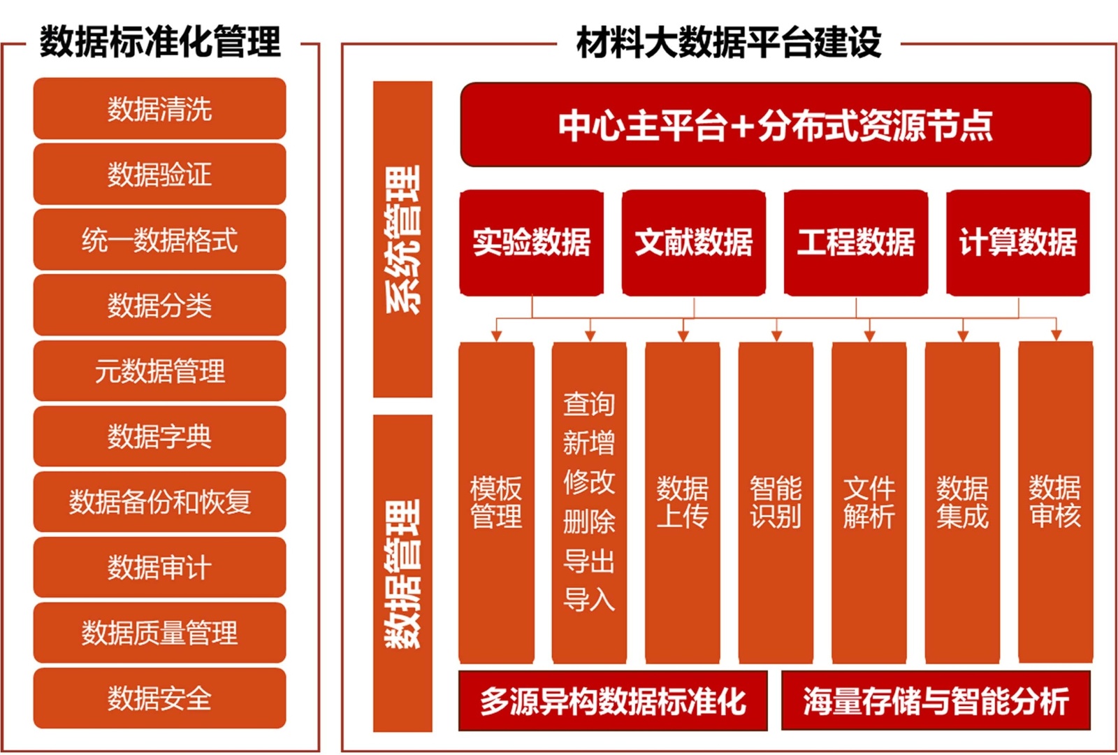 数据标准制定:统一的数据标准和规范是实现参数数据采集、处理、融合、汇交、存储、大数据挖掘的前提,也是确保数据和服务可扩展性和通用性的基础。材料研究所涉及材料数据包括制备表征数据、生产工艺数据、生命周期数据、服役性能数据等异构数据,以及来自不同数据库的分散、异构、跨尺度数据,通过广泛参考已有建筑材料术语词典、本领域国家行业标准规范,充分调研建筑材料研发数据需求,建立适用于建筑材料研究所涉及的材料数据设计、制备工艺技术、提交和共享的统一数据标准规范;