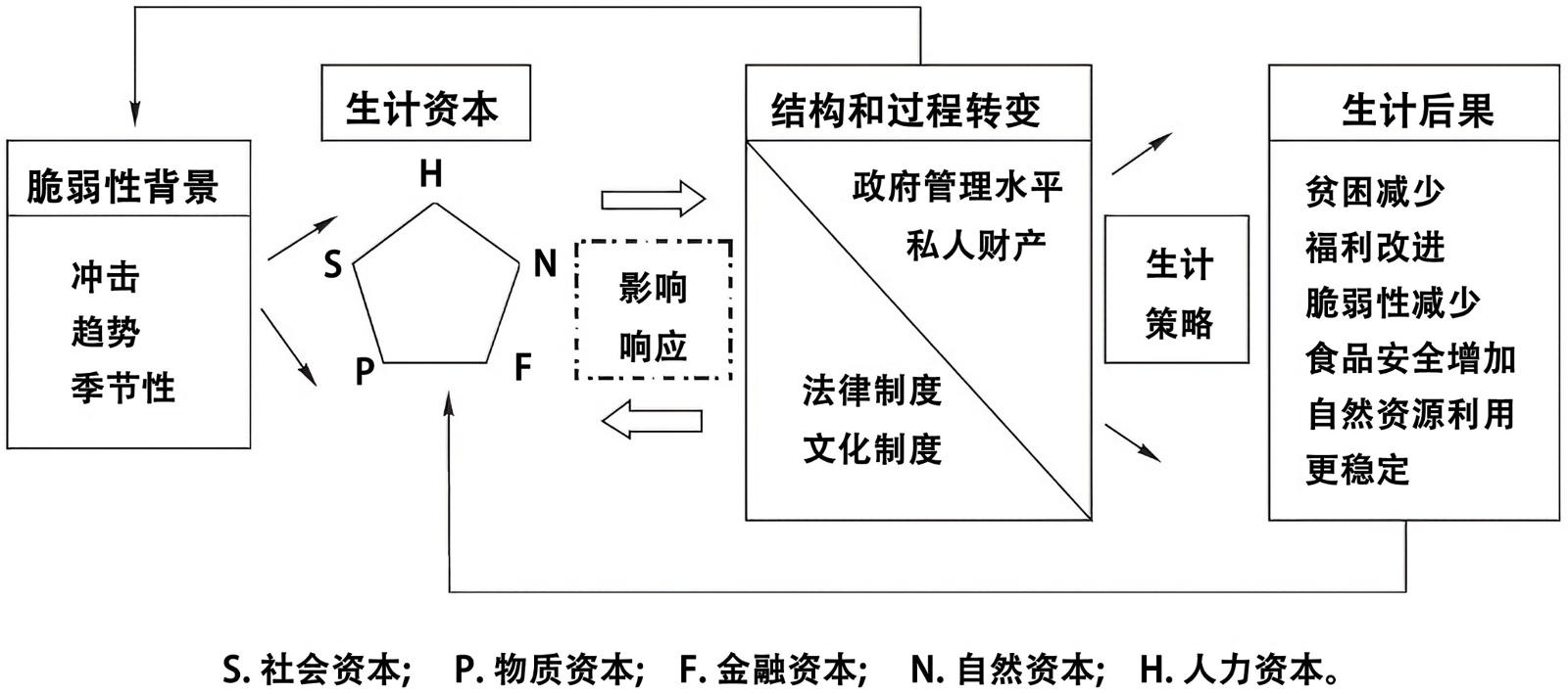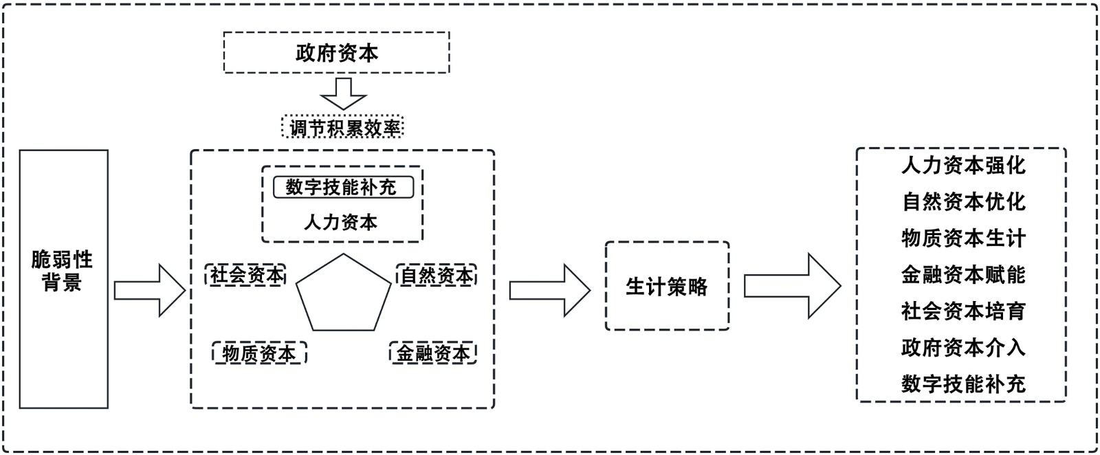 20世纪80年代,首次提出“可持续生计”概念,倡导将稳定生计确立为消除贫困、提升发展援助效能的核心目标[8],这一理念的提出,标志着国际社会转向系统性生计的构建。20世纪末至21世纪初,Chambers等学者进一步深化理论建构,将生计界定为个体或群体的谋生方式,该理论强调,可持续生计需满足三重维度:一是应对外部压力的韧性,二是在危机产生后能够恢复并提升生计能力,三是在形成正向收益的传导机制[9]。在基础理论之上,学者与国际组织展开了框架化探索,Scoones构建的可持续农村生计分析框架具有里程碑意义,该框架包含特定背景、生计资本、制度因素、生计策略及生计结果五大要素,这一框架为后续实践工具的开发奠定了重要理论基础[10]。