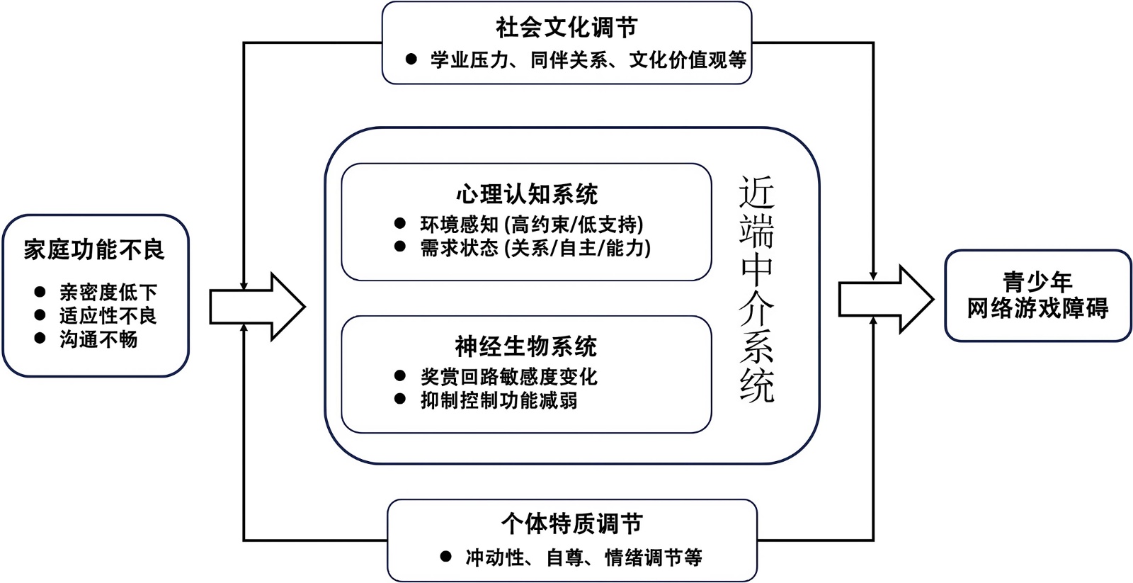 本文通过叙事性综述,系统探讨了家庭功能与青少年网络游戏障碍(IGD)之间的关系及其内在心理与神经机制。综述表明,基于Olson环状模型的家庭功能(亲密度、适应性、沟通)不良是IGD的重要风险因素,而良好的家庭功能则具有保护作用。二者之间的关联主要通过三条关键路径实现:(1) 塑造青少年对家庭与休闲环境的消极感知;(2) 阻碍其基本心理需求(关系、自主、能力)的满足;(3) 可能影响与成瘾相关的大脑奖赏回路功能。此外,个体特质与社会文化因素在这一过程中起重要的调节作用。将上述内容进行整合,可以得出一个系统性的理解框架(见图1)。