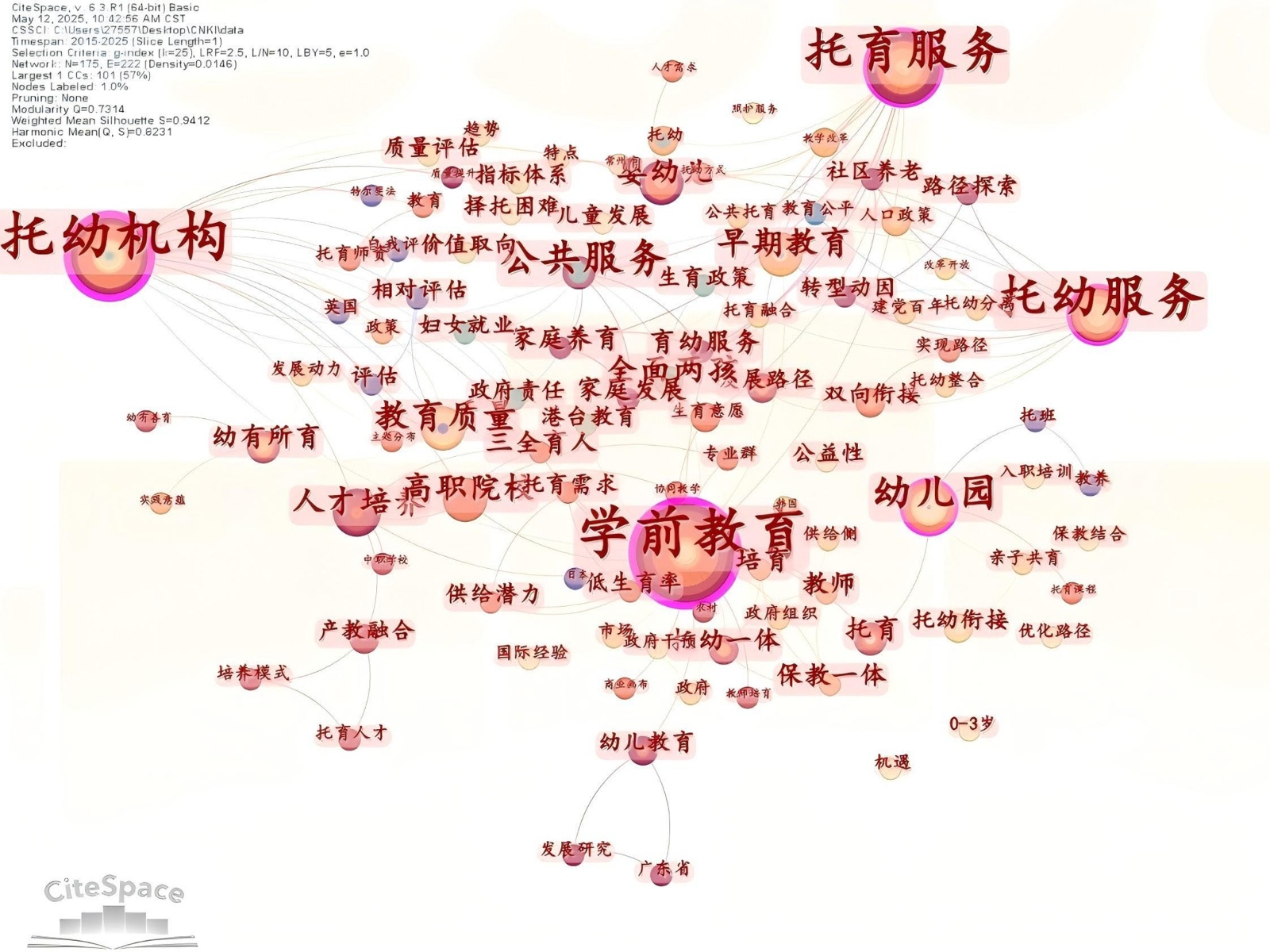 本文仅以CiteSpace对CNKI核心期刊文献进行计量,虽能勾勒知识骨架,却无法判别文本的理论深度与政策建议的可行性;质性层面的概念精度、论证强度及价值立场均被排除在外。单一中文库来源必然放大“高校–政策评述”类研究的可见度,遗漏学位论文、地方报告等成果,或致覆盖偏差。此外,综述写作与刊出之间存在12~18个月时滞,而近年正值托育政策密集更新,突现关键词可能已被后续文件修正,时效性局限尤需警惕。未来研究宜引入多库数据与混合方法,对计量结果进行内容编码与滚动更新,以弥补上述不足。