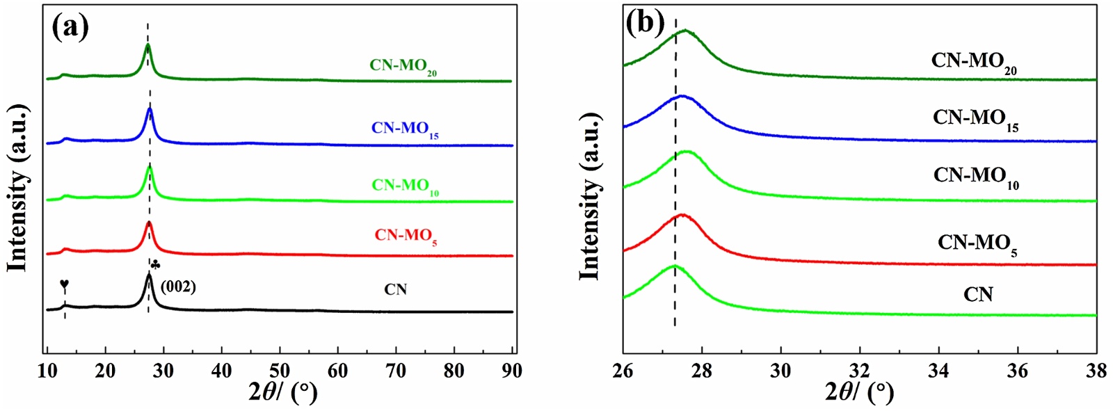 利用X-射线衍射(XRD)对CN及CN-MO的物相结构进行分析,结果如图1所示。从图1(a)可以看出,所有样品都有两个明显的衍射峰,位于13.0˚处的衍射峰为g-C3N4的(100)面,归属于面内周期排布的三嗪结构单元。在27.3˚处的衍射峰为g-C3N4的(002)面,是共轭芳香系统堆叠形成的。从图1(b)为1(a)的局部放大图,从图中可以看出,与CN相比,CN-MO的(002)峰略微向右偏移,表明MO的嵌入导致层间距有所减小,这将更加有利于反应时催化剂的电荷转移,从而有利于提升催化剂的光催化性能。