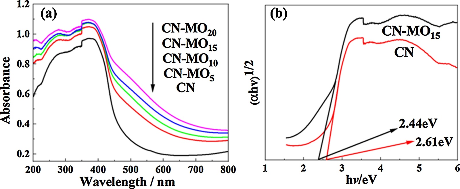 图4. CN和CN-MO的紫外–可见漫反射光谱(a)及带隙图(b)