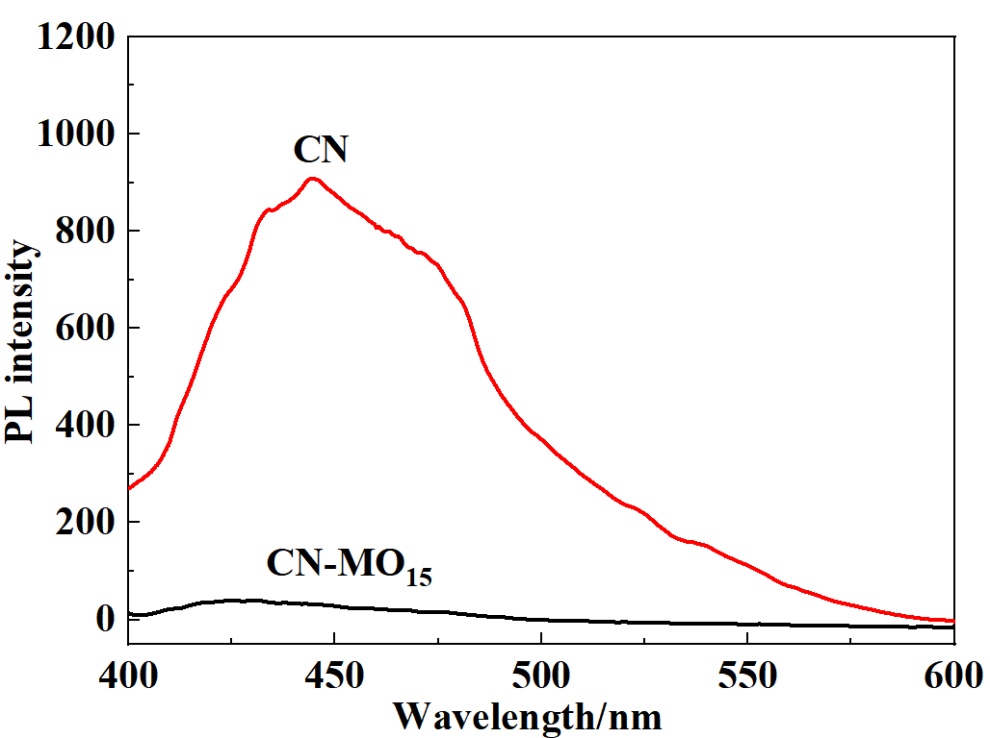 采用光致发光光谱(PL)对样品光生载流子分离特性进行分析,结果如图5所示。荧光强度越低表明光生载流子复合率小。从图中可以看出,CN在445 nm处有很强的荧光发射峰,MO嵌入CN后,发射峰强度下降。表明经过修饰后,CN催化剂的电荷分离效果得到显著提升,光生载流子复合率大大降低,能产生更多的活性位点,进而有利于光催化反应的进行。