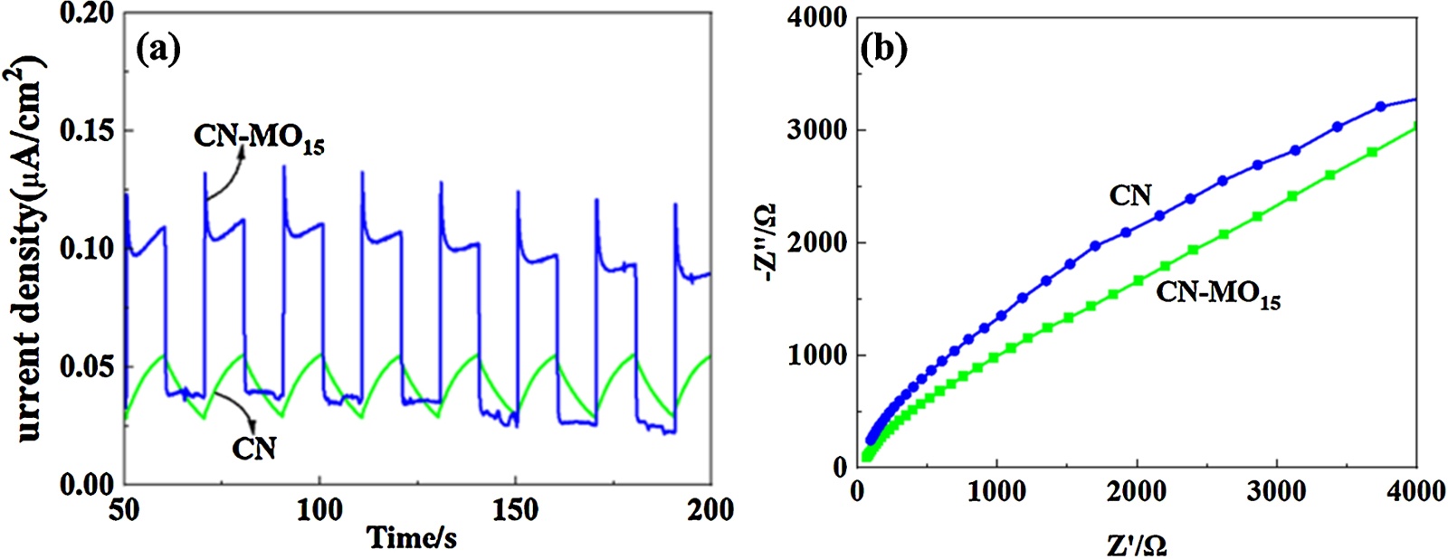 图6. CN和CN-MO15的瞬态光电流密度图(a)及阻抗图(b)
