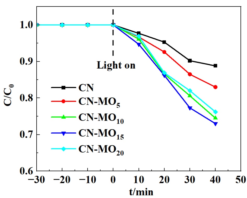 不同催化剂样品的反应速率常数依次为:CN (0.00397 min−1)、CN-MO5 (0.00563 min−1)、CN-MO10 (0.00962 min−1)、CN-MO15 (0.01006 min−1)及CN-MO20 (0.0866 min−1)。CN-MO15的动力学常数是纯CN的2.53倍,进一步证明了与CN相比,CN-MO有更好的降解四环素的效果。