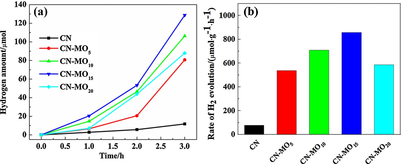 图9为样品在可见光照射下的光催化产氢性能。从图中可以看出,与CN产氢速率(78.274 μmol·h−1·g−1)相比,CN-MO样品的光催化产氢速率均有所增强。其中CN-MO15达到了858.14 μmol·h−1·g−1,是CN的10.96倍。此外,从光催化降解四环素和产氢性能中可以看出,当MO含量的过高时候,会导致其光催化活性降低,这可能归因于过多MO会成为电子和空穴复合的中心。