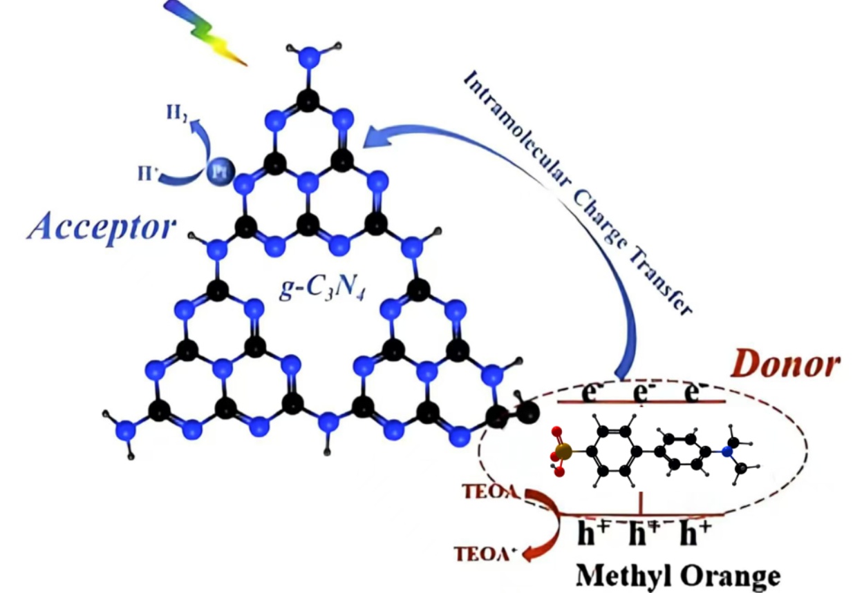 作为一种非金属半导体光催化材料,石墨氮化碳(g-C3N4)具有优异的光稳定性和催化活性,且制备成本低廉,受到研究者的广泛关注[1] [2]。但其可见光吸收范围有限、层间载流子迁移效率不足的缺陷导致其光催化效率较低[3] [4]。针对上述问题,研究者采用了形貌调控、掺杂及异质结构建等改性策略[5] [6]。Mun和Park [7]通过引入N、P、S等非金属元素进行掺杂,优化载流子迁移路径与电子云密度分布,显著增强了g-C3N4的光吸收性能与电荷分离效率。研究表明,磷掺杂不仅拓宽了g-C3N4的光吸收范围,更显著促进了其光生电荷分离,实现了制氢效率的提高[8]。构筑异质结是改善g-C3N4性能的另一种方法,g-C3N4通过与ZnO、TiO2及MoS2等半导体形成异质结[9],能有效降低光生电子空穴对的复合,进而改善g-C3N4的光催化性能。将二维过渡金属碳化物Ti3C2MXene与g-C3N4构筑异质结构时,其高导电性可有效增强光生载流子的定向迁移与空间分离效率。该复合催化剂表现出优异光解水产氢性能[10] [11]。此外,通过热剥离工艺与表面缺陷工程的协同作用,也可同步提升材料比表面积与光捕获效率。Chen团队[12] [13]开发的磷掺杂结合热剥离技术,成功制备出具有高活性位点的g-C3N4基催化剂,该催化剂具备良好的的光催化性能。尽管通过上述改性策略g-C3N4的光催化性能得到一定程度的改善,但是其在实际应用过程中的光催化效率及稳定性仍有待提高[14]-[16]。因此,开发兼具高活性、强稳定性与低价的新型光催化体系,是目前研究的重点。研究发现:甲基橙(MO)作为一种典型的偶氮染料,其分子结构中富含苯环、偶氮键(−N=N−)及磺酸基团(−SO3H),这些特征官能团不仅可以缩小材料带隙,拓宽可见光响应范围,还具备独特的电子给体–受体特性,能增强电荷分离,此外MO的磺酸基团可作为电子捕获位点,因此将MO嵌入的g-C3N4体系有望改善其光催化性能。