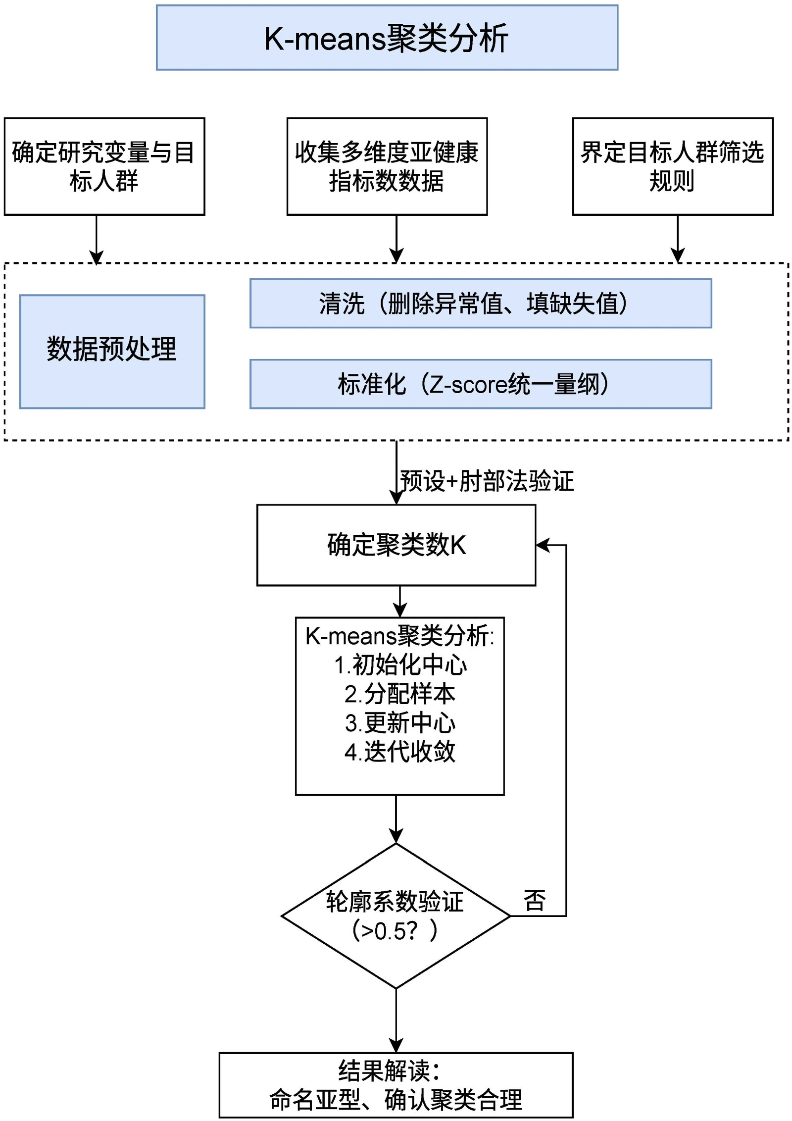 一是确定研究变量与样本,选取亚健康相关多维度指标,并收集目标人群数据。二是数据预处理,清洗数据,删除极端异常值、用均值/中位数填充缺失值,再标准化处理以消除变量数值范围差异的影响。三是确定聚类数量K,结合研究假设或文献预设K值,用“肘部法”验证确定最终K值,计算不同K的误差平方和SSE,选SSE下降变缓的K值。四是执行K-means聚类,先初始化簇中心,再计算样本与中心的欧氏距离分配样本、更新簇中心,迭代至中心稳定。