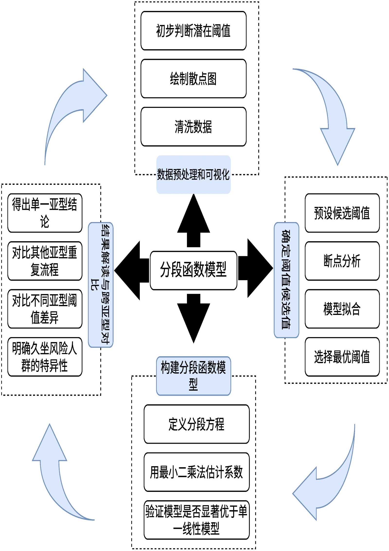 在通过聚类分析明确健康状态分型后,分段函数模型再针对每一类细分人群,将其拟合为“久坐时长”与“亚健康风险”的关联模式,从而精准定位不同人群中久坐行为的“风险阈值”,例如可发现某一亚健康亚型人群每天久坐超过6小时后,亚健康风险会出现显著升高的拐点。这种基于聚类结果的分段分析,最大优势在于摆脱了“一刀切”式的统一阈值结论,让研究结论更具针对性和实践指导意义。流程可分为以下步骤如图2: