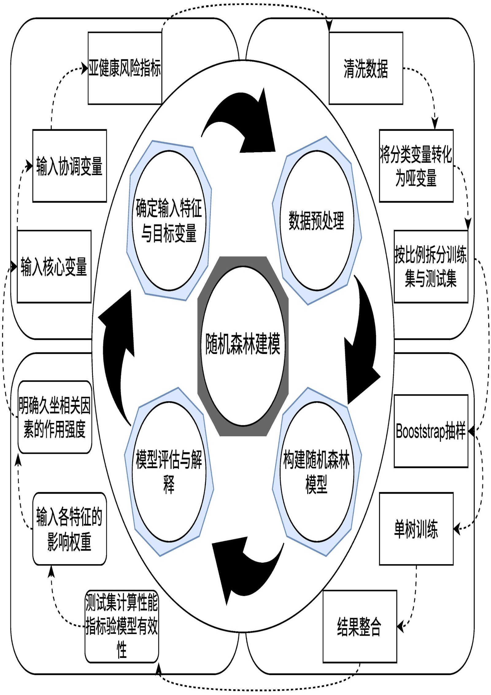 该模型的核心逻辑:构建多棵决策树,通过集成学习降低过拟合风险。每棵树基于Bootstrap抽样数据训练,通过基尼指数或均方误差划分特征,最终风险预测为多棵树的投票/均值结果[8]。随机森林能捕捉非线性关系和特征交互,对缺失值和异常值具有较强鲁棒性。在运用随机森林模型研究久坐人群的健康问题时,流程可分为以下步骤如图3:
