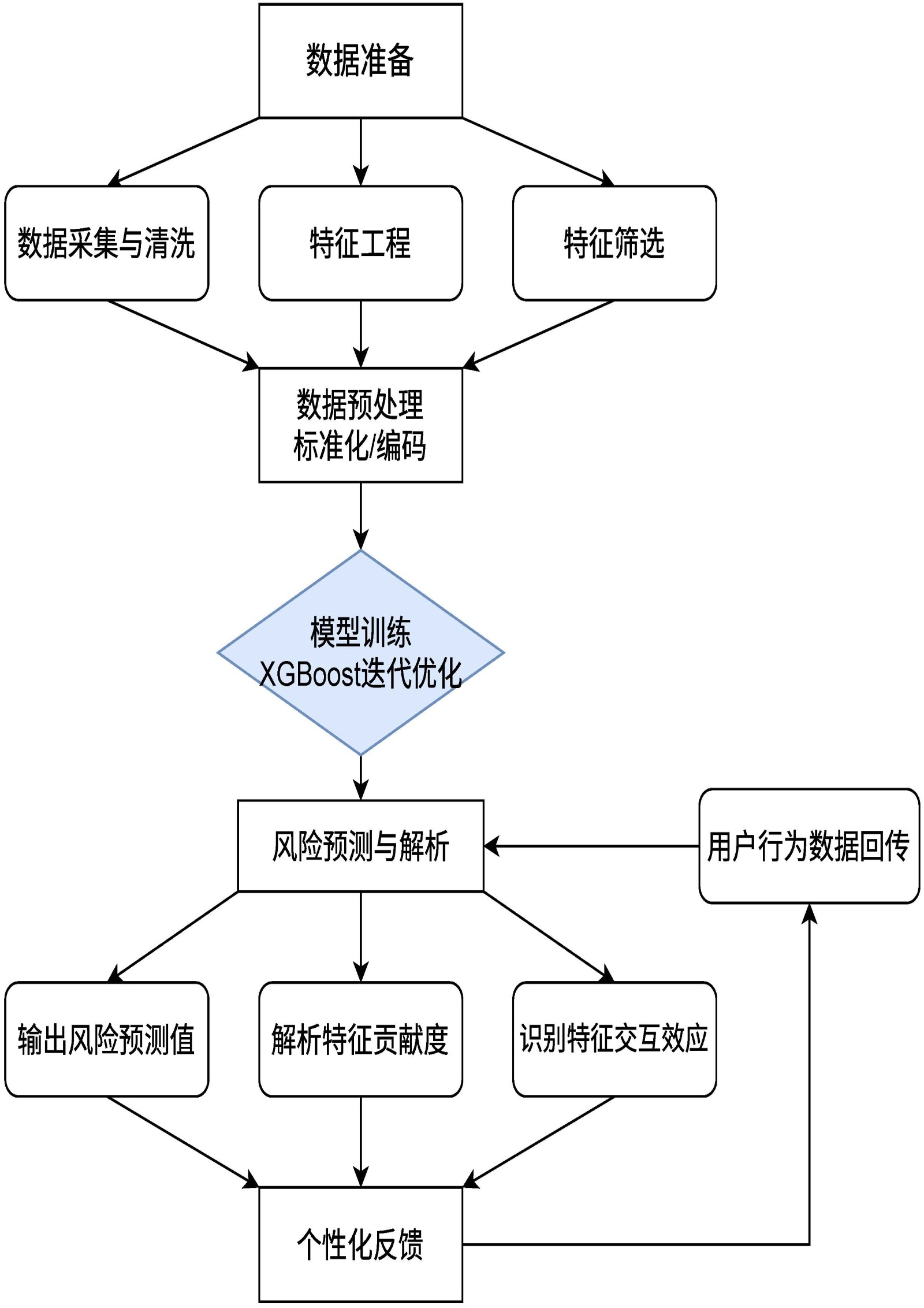 数据采集好后,先以随机森林筛选出“久坐间隔时长”等与亚健康强相关的核心特征,再经预处理生成适配梯度提升树的衍生特征。XGBoost从初始模型开始,每轮训练决策树拟合前序误差,通过目标函数控复杂度防过拟合,借助泰勒展开提升训练效率。模型输出实时风险值后,用SHAP值量化久坐行为细微影响并识别多因素交互,再转化为易懂提示与个性化建议,结合用户后续数据持续迭代,以适配应用“实时监测–精准干预”需求,在特征筛选基础上进一步提升预测精度与建议针对性。