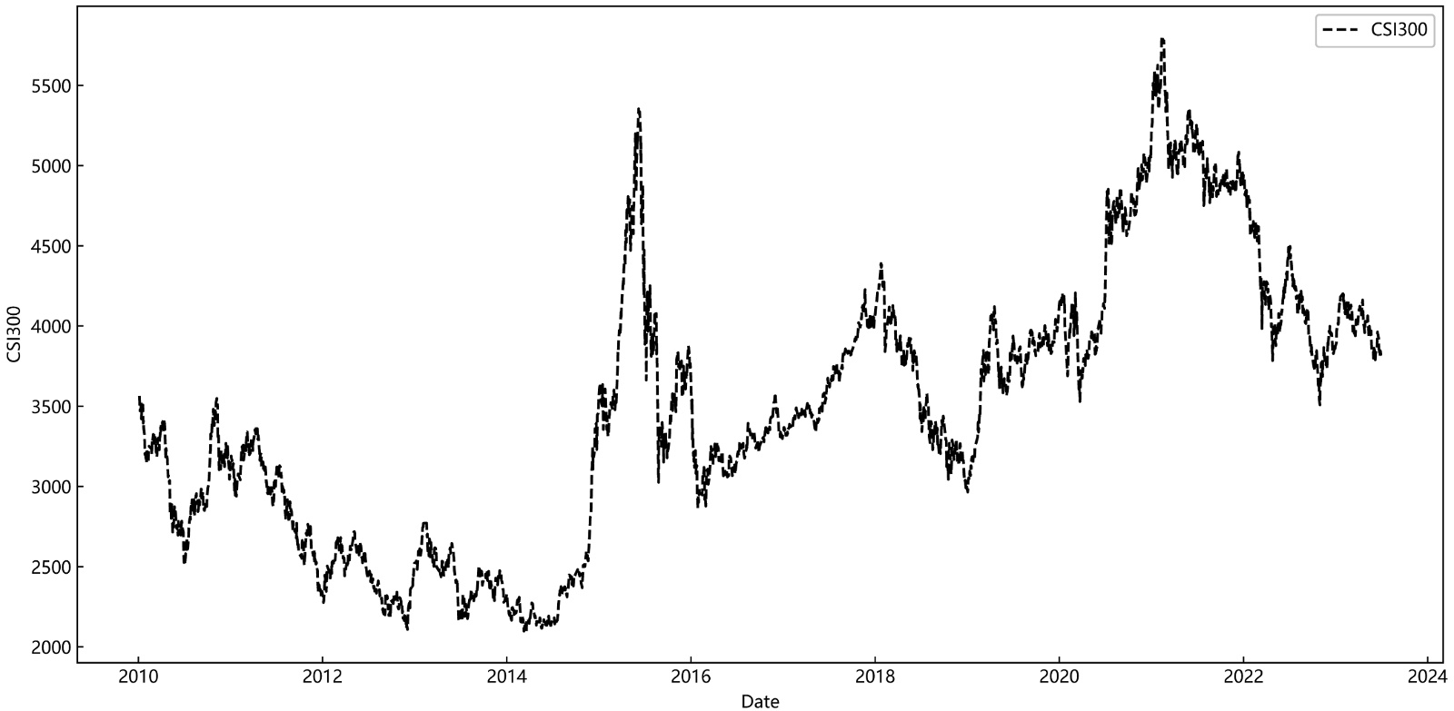 沪深300指数作为反映A股市场整体走势的核心基准,覆盖了A股市场300家规模大、流动性好的代表性企业,能够反映股市整体表现与波动。经济政策不确定性指数则是常用于衡量政策环境变化及其对宏观经济与金融市场影响的重要指标。为探究政策不确定性对股票市场波动的影响机制,本文选取沪深300指数日度收盘价,以及Baker等人[12]构建的中国月度经济政策不确定性指数作为研究样本。样本周期分别为2010年1月4日至2023年6月30日,分别包含3279个日度数据和162个月度数据,数据来源于Wind数据库及经济政策不确定性网站(http://www.policyuncertainty.com/chinamonthly.html)。日收益率定义为