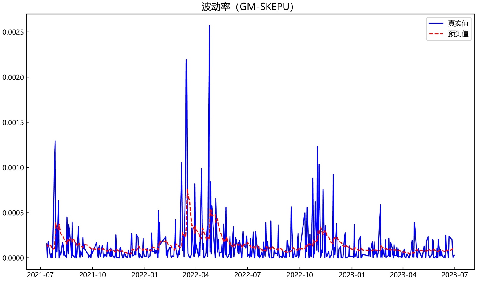 显著为正,为EPU影响市场风险形态提供了直接证据。理论上,EPU会通过投资者情绪和融资约束等渠道强化市场对负面信息的反应,导致收益率分布呈现负偏态,并显著提升尾部风险表现为峰度上升。该系数的显著性验证了EPU会推高市场峰度的预期,表明政策不确定性的增加会加剧股市的极端尾部风险。最后,从模型拟合效果来看,GM-RV模型的LLF和AIC均优于传统GARCH模型,表明引入长期波动成分有助于提升模型拟合能力。与GM-RV模型相比,GM-EPU和GM-SK模型均进一步改善了样本内拟合效果,说明CEPU,尤其是时变高阶矩的引入对提升模型拟合效果具有显著作用。值得注意的是,GM-SKEPU模型在所有模型中拟合最佳(LLF值最大和AIC值最小),验证了同时纳入CEPU与时变高阶矩对提高股票收益率样本内拟合精度的重要性。