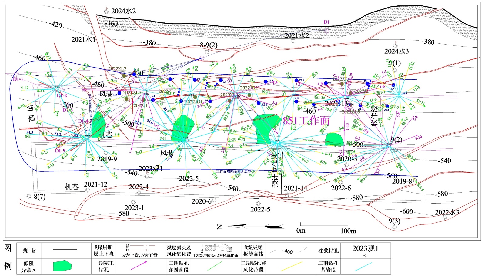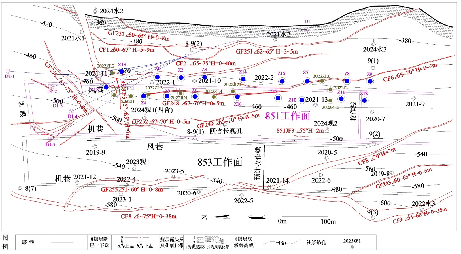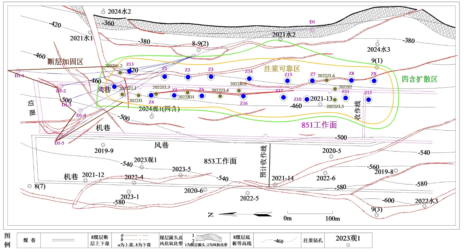 (4) 工作面已安全回采,回采期间未出现顶板滴淋水或其他异常出水情况,成功解放了851工作面90万t煤炭储量,避免了突水溃砂风险,兼具显著经济与社会效益。工程技术方案与评价体系为我国浅部薄基岩区、近松散含水砂层工作面的注浆改造提供了可复制的技术参考与工程示范,为煤炭资源安全高效开采提供了地质保障。