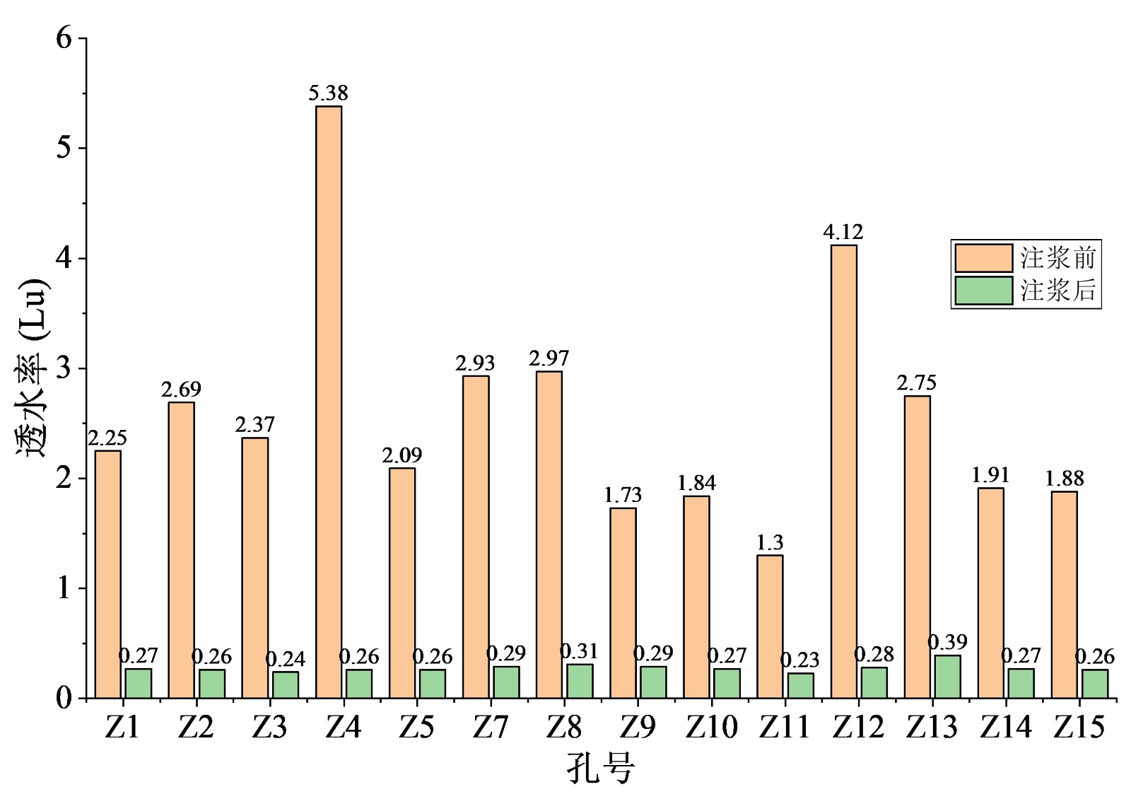 (1) 注浆改造工程成效显著,全面改善了目标地质单元的水文地质性质。“四含”透水率由注浆前2.55~11.76 Lu降至0.39~2.57 Lu,透水性从弱–中等透水转为微–弱透水,富水性达弱富水等级;风化带透水率从1.3~5.38 Lu降至0.23~0.39 Lu,成为微透水的相对隔水层;断层带透水率由0.2~1.11 Lu降至0.02~0.1 Lu,转变为极微透水的良好隔水层,有效阻断了地下水渗流通道。