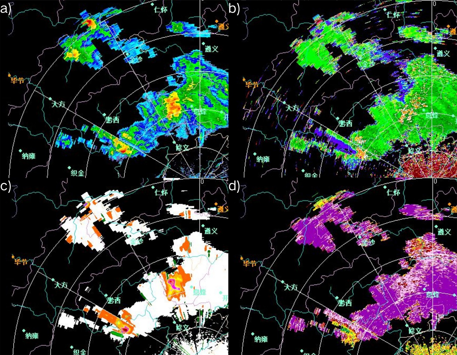 本文所用资料包括:(1) 贵阳龙洞堡机场C波段双偏振天气雷达资料,该雷达采用“双发双收”工作体制,能够同时发射水平和垂直极化波,获得反射率因子(Z)、速度(V)、差分反射率(
