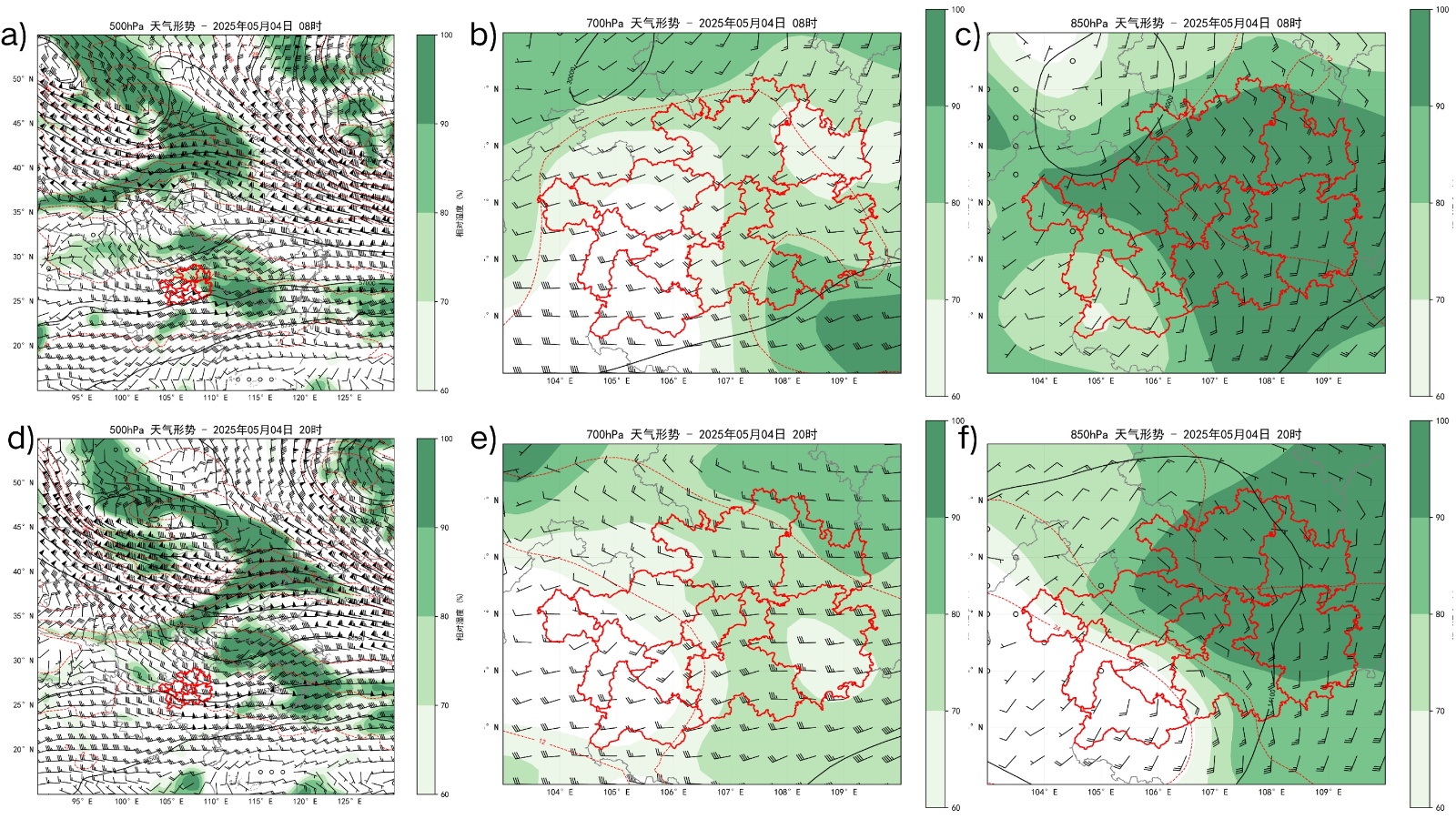 图1. 5月4日08:00和20:00天气形势图((a) 500 hPa 08:00, (b) 700 hPa 08:00, (c) 850 hPa 08:00, (d) 500 hPa 20:00, (e) 700 hPa 20:00, (f) 850 hPa 20:00)