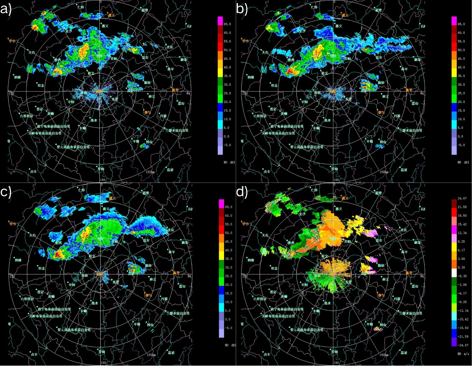 图6. 5月4日16:40双偏振参量((a) 1.5˚Zh, (b) 1.5˚ZDR, (c) 1.5˚KDP, (d) 1.5˚Cc)