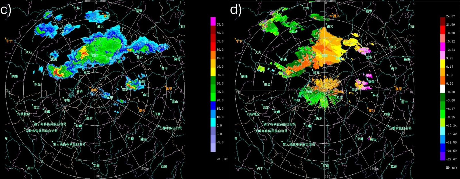 Figure 3. Plots of base reflectivity at various elevation angles and radial velocity at 1.5˚ elevation angle at 16:40 on 4 May ((a) 1.5˚Zh, (b) 2.4˚Zh, (c) 3.4 ˚Zh, (d) 1.5˚V)