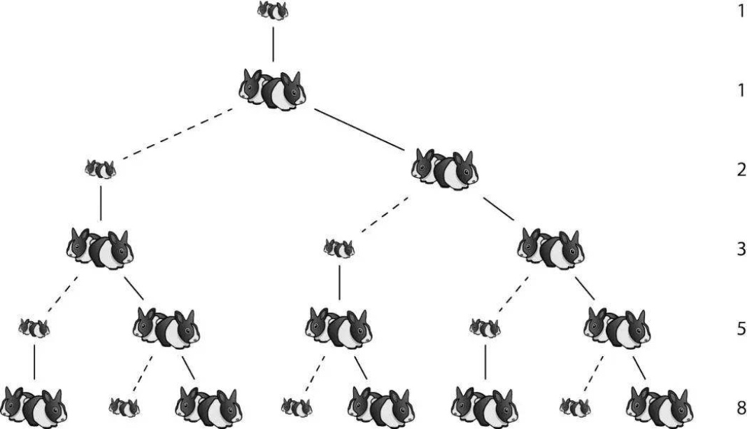 我们仍然以数列的极限为例,探讨数学之美与应用的具体教学设计。首先引入一个现实世界中具有广泛应用背景的数列的实例——斐波那契(Fibonacci)数列。已知兔子在出生两个月后就有繁殖能力,一对成兔每月能生出一对幼兔。假设所有兔子都不死,我们就能得到这样一个兔子数列(图2)。