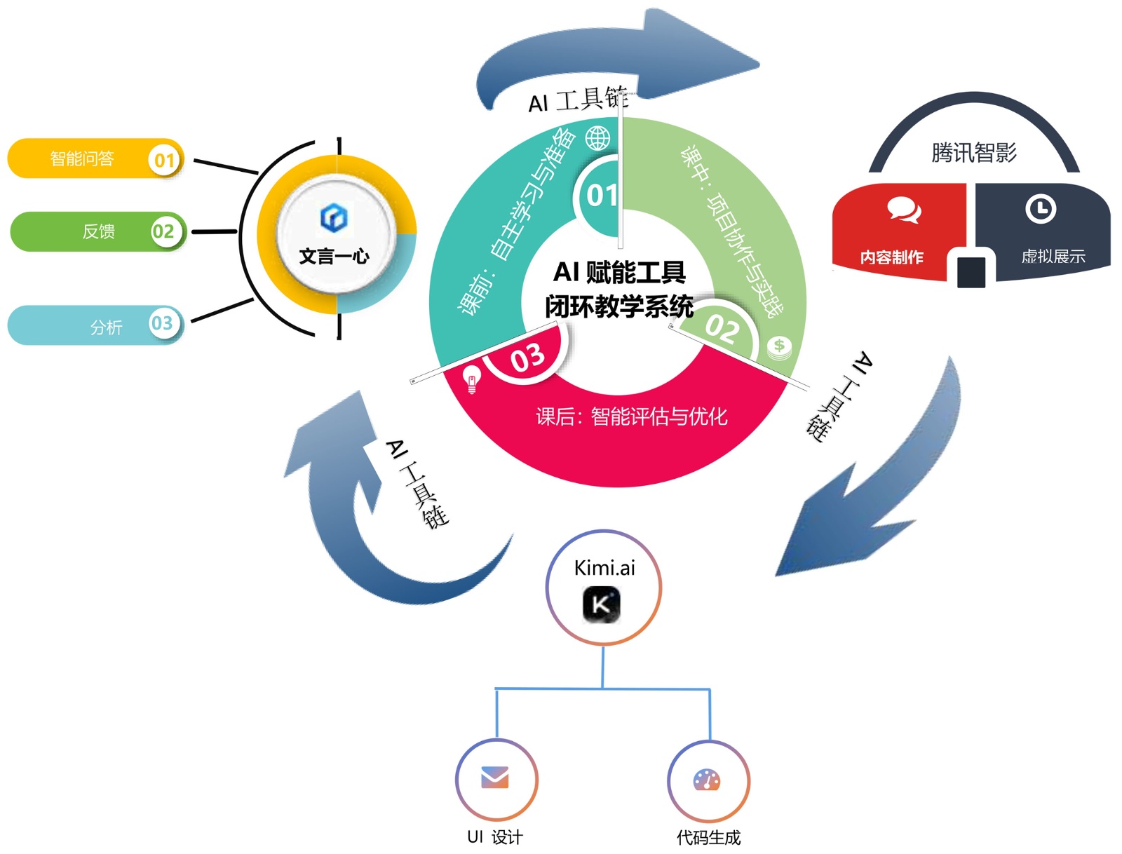 AI工具集:文心一言(智能问答与代码反馈)、Kimi.ai (UI设计辅助与代码生成)、腾讯智影(交互案例视频制作与虚拟展示)。