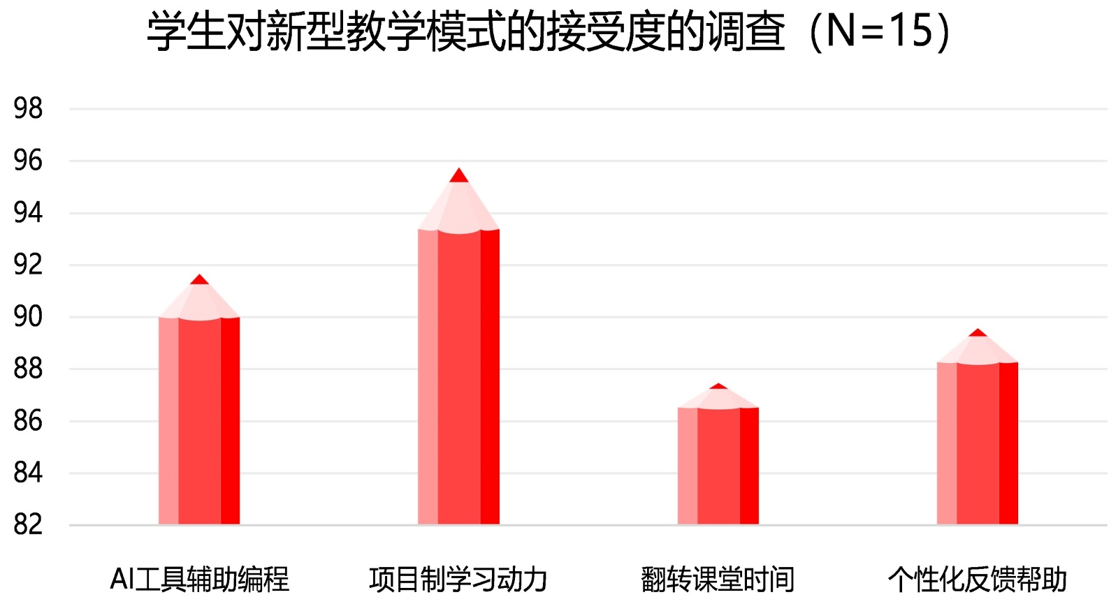 调查结果显示,学生对新型教学模式的整体接受度较高,四个维度的平均得分均超过4.2分(满分5分)。其中,项目制学习带来的成就感和学习动力获得最高认同(95.8%的学生表示同意或非常同意),其次是AI工具对编程学习的辅助作用(91.7%)。具体分布如图3所示: