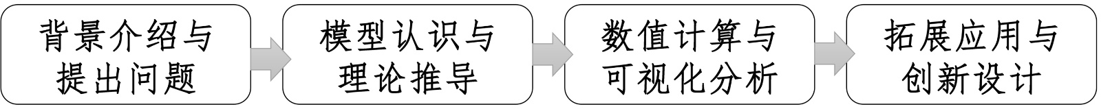 本项目式学习以卫星轨道位置随时间的变化为主题,启发学生充分利用导数工具解决问题。基于已学的导数定义、复合函数求导法则、隐函数求导法则推导理论过程,运用编程工具(Python/Matlab)实现轨道与速度矢量的可视化,验证导数在卫星瞬时速度计算与轨道特性分析中的关键作用。项目学习设计四环节结构,从背景介绍与提出问题、模型认识与理论推导、数值计算与可视化分析,到拓展应用与创新设计,形成逻辑严密、层层递进的学习流程(见图1)。项目内容注重跨学科整合与能力培养,将抽象的导数概念与航天工程实际紧密结合,既巩固了学生对隐函数求导、复合函数求导等知识点的理解,又锻炼了数学建模与编程可视化能力。同时,通过引入“北斗”“嫦娥”等国家航天成就,课程自然融入科技报国、严谨求实的课程思政元素,激发学生探究兴趣与社会责任感,实现知识传授、能力提升与价值引领的有机统一。