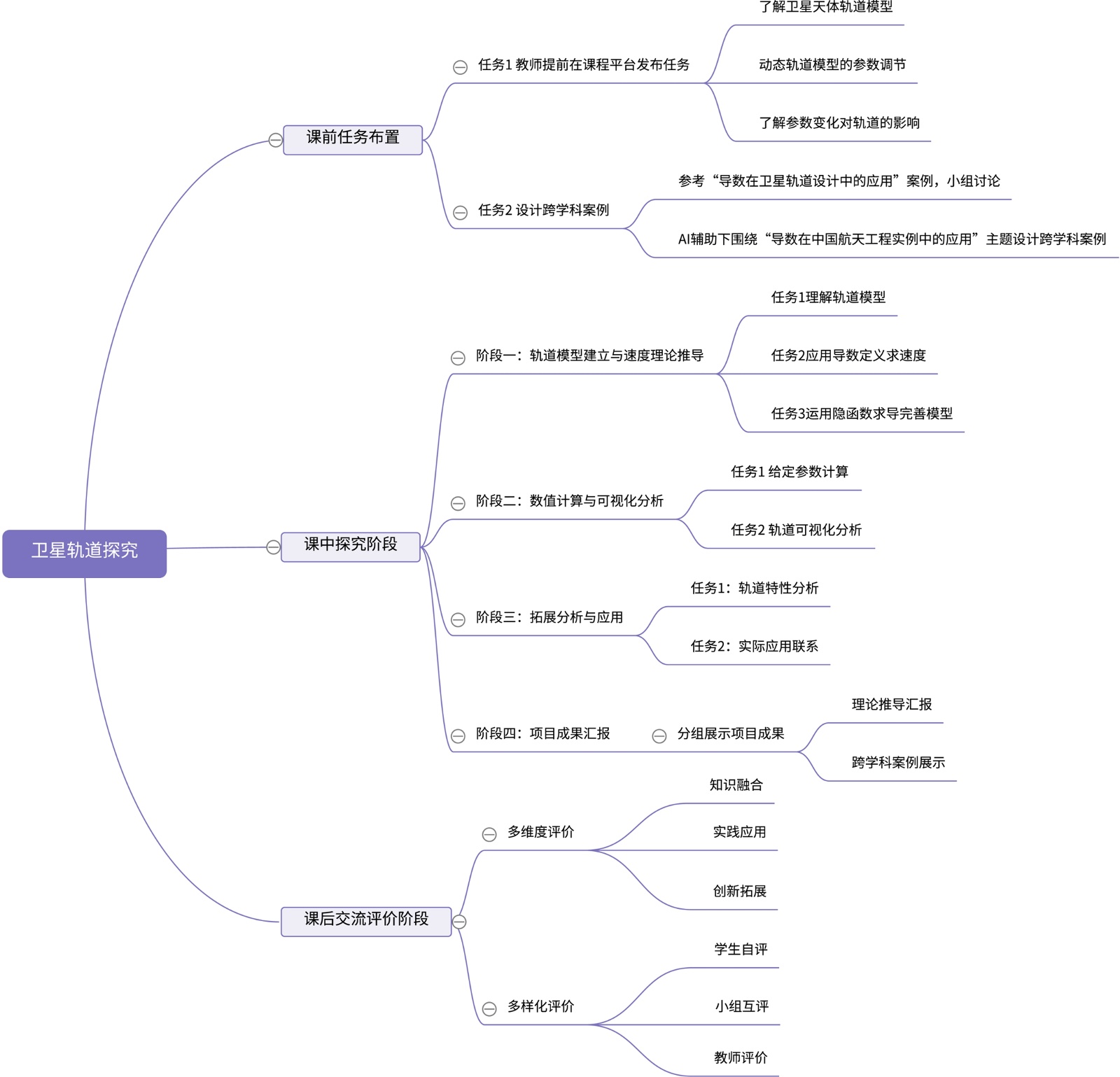 (1) 发现问题与提出问题阶段:通过分析卫星轨道动态图与基本轨道参数,引导学生观察卫星位置随时间变化的规律,提出“如何运用导数精确计算卫星在椭圆轨道上的瞬时速度”这一核心科学问题,并建立数学模型(位置矢量r(t)与物理问题之间的关联。