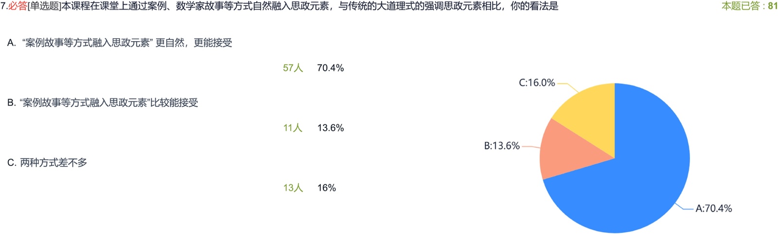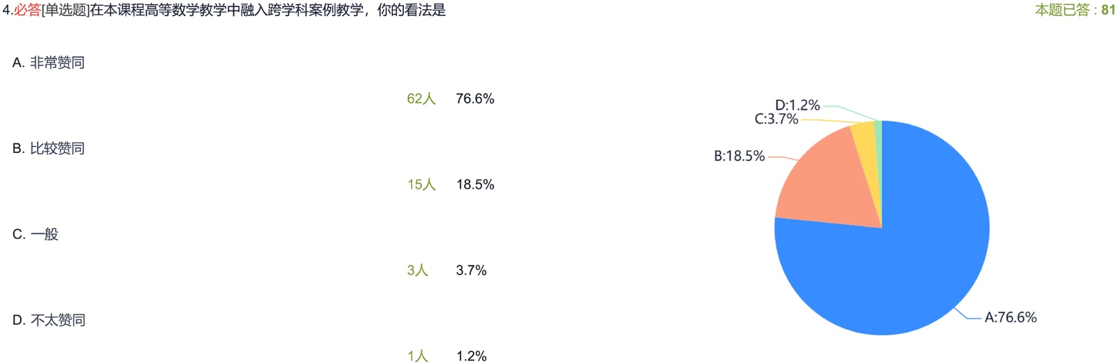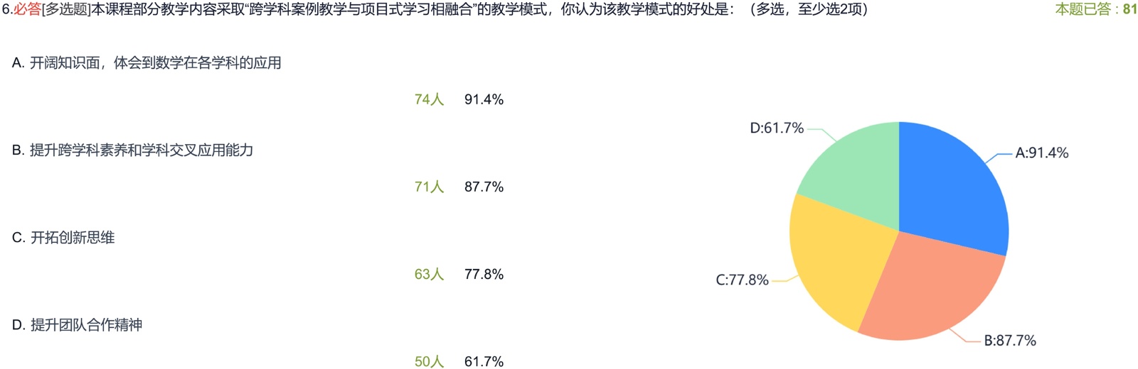 本学期课堂尝试跨学科项目式学习,普遍受到学生认可。问卷结果如下:对“本课程课堂教学中融入跨学科案例”这一尝试,76.6%的学生表示非常赞同,18.5%的同学表示比较赞同,得到认可的比值为95.1,数据结果见图3。对课堂教学中尝试项目式学习,学生普遍认可。如图4数据所示,认可率为90.2,其中非常赞同占比74.2%,比较赞同占比16%,学生对“跨学科项目式学习”的看法如图5。认可度最高的是选项A,91.4%的学生认为“跨学科项目式学习”开阔了知识面,体会到数学在各学科的应用;其次是选项B,87.7%的学生认为“跨学科项目式学习”提升了跨学科素养和学科交叉应用能力。选项C和D也比较认可,分别占比77.8%和61.%,但相比于A、B选项比值略低,表明在以后跨学科项目式学习活动的组织中还需加强活动设计,以进一步提升创新思维和团队合作能力。从图6可见,84%的学生认为通过跨学科案例、数学家故事、数学史等等方式自然融入的思政元素比传统大道理式的思政融入更能接受。这也启发我们在今后的跨学科项目式学习中,可以提炼思政元素融入课堂,培养能力与品质同步提升的跨学科复合型人才。