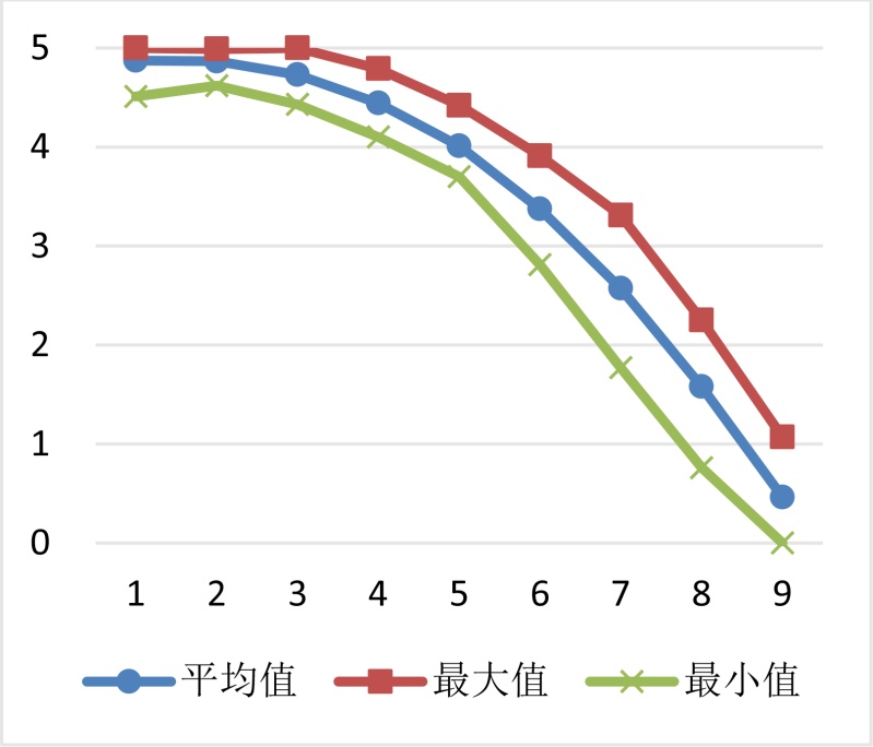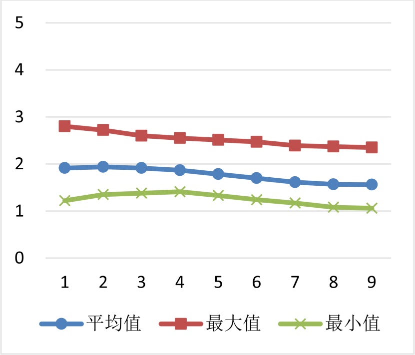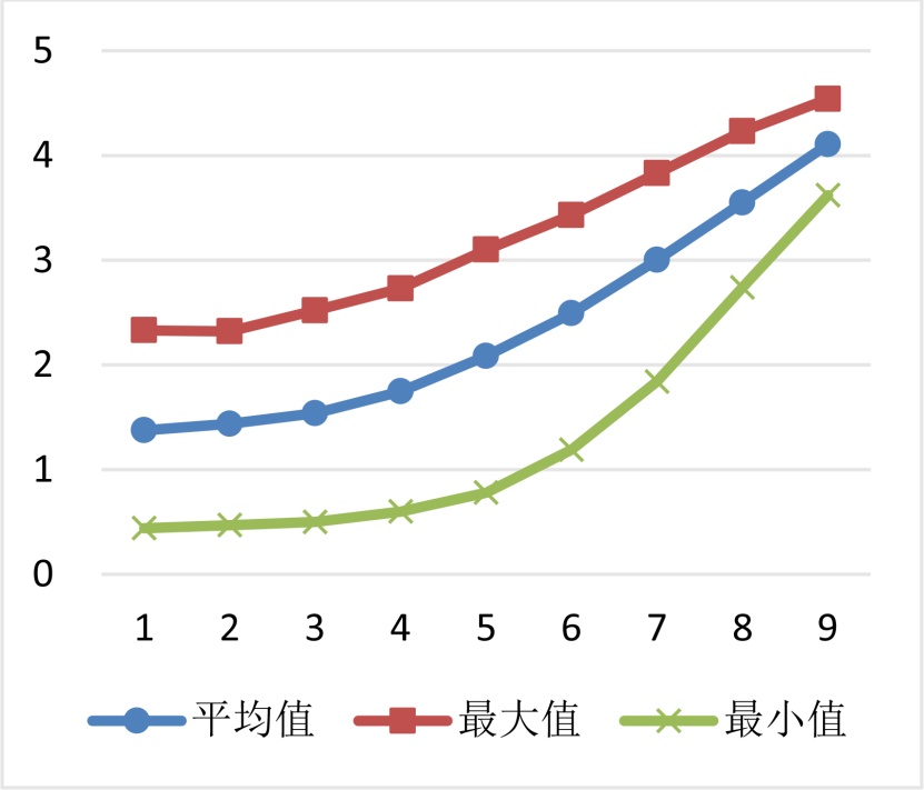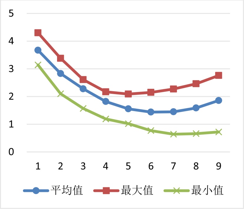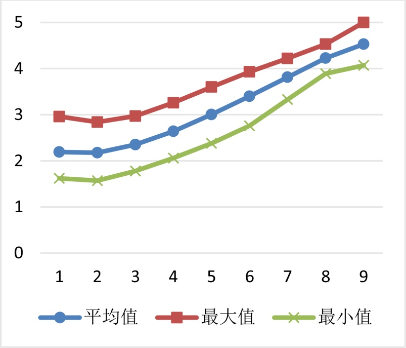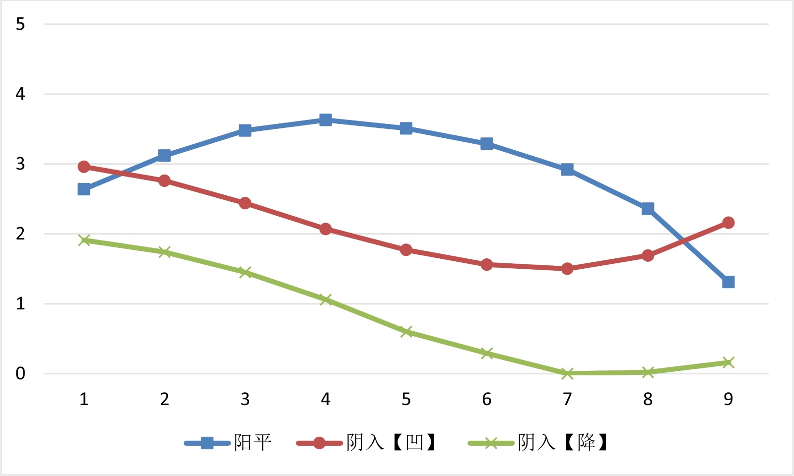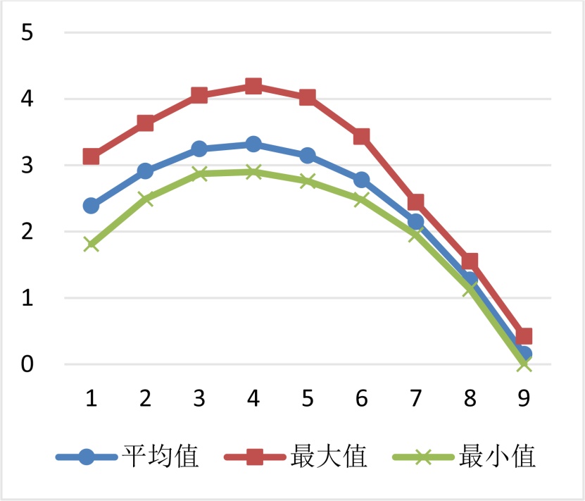 图7显示,阴入调起点的最大值为4.3,最小值为3.14;终点最高为2.76,最低为0.72。从三条曲线的分布空间看,平均值与最大值距离较近,数据分布的趋势向上集中。