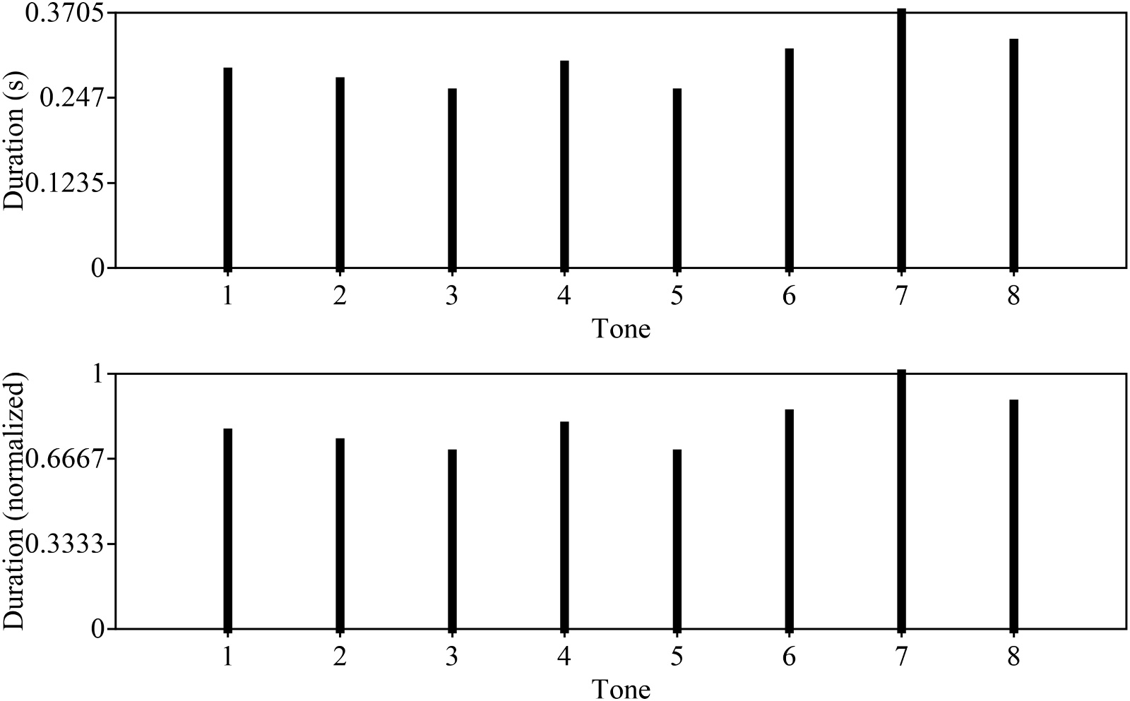 Figure 11. Absolute duration (top figure) and relative duration (bottom figure) of eight single tone tones in Shangtang Wenzhou dialect
