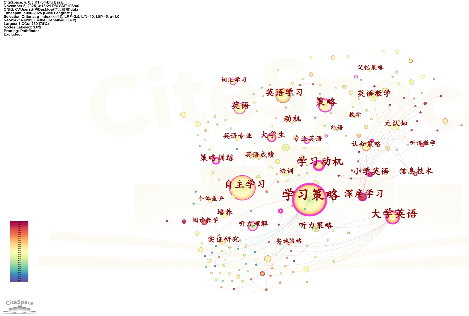 从时间维度看,“学习策略”贯穿始终,一直是研究的核心焦点。“学习动机”“自主学习”和“深度学习”等节点也相继凸显,研究逐渐向学习者心理、认知和主动性等方面拓展;从主题维度看,不仅包含“学习策略”这一宏观主题,还包含“听力策略”和“阅读教学”等具体的实践应用;从主体维度看,研究涵盖“大学英语”和“小学英语”等不同的教育阶段,体现出研究主体的广泛性。
