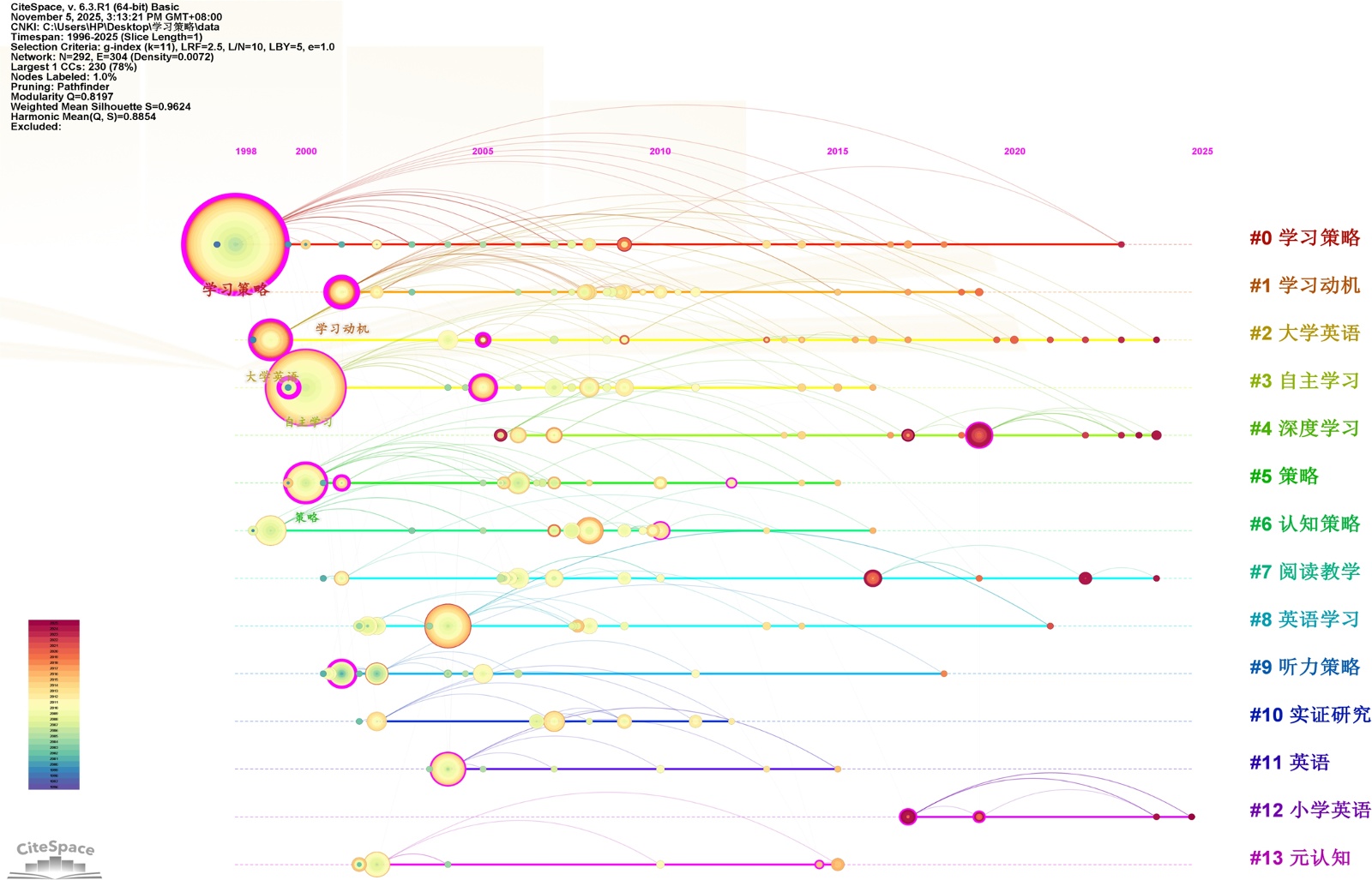 为更清晰地梳理国内外语学习策略研究热点在历年的发展脉络与时间演变轨迹,通过CiteSpace软件的“Timeline View”功能,生成1996~2025年外语学习策略研究关键词共现时间图谱(见图6)。该图谱可以直观呈现各聚类之间的相互联系以及每个聚类内部各节点的历时演变进程[17]。