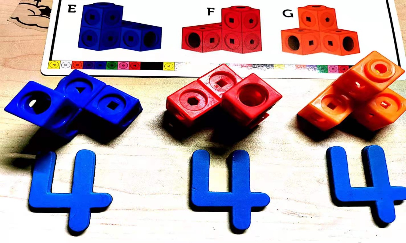 第一,数学教学材料使用乐高数学教具、数字和“加减乘除”符号模型,教学任务有两个,一个是按照图片的指示,将乐高拼搭成和图片中示范出的形状一样;另一个是通过操作教具、数字和符号模型,认识数字和了解数与量的对应,或者做出两道算术题,均为十以内的加减法。但由于学习者的年龄跨度较大(2~7岁),因此,根据每一个年龄段,具体的教学任务略有调整,详见附件二。