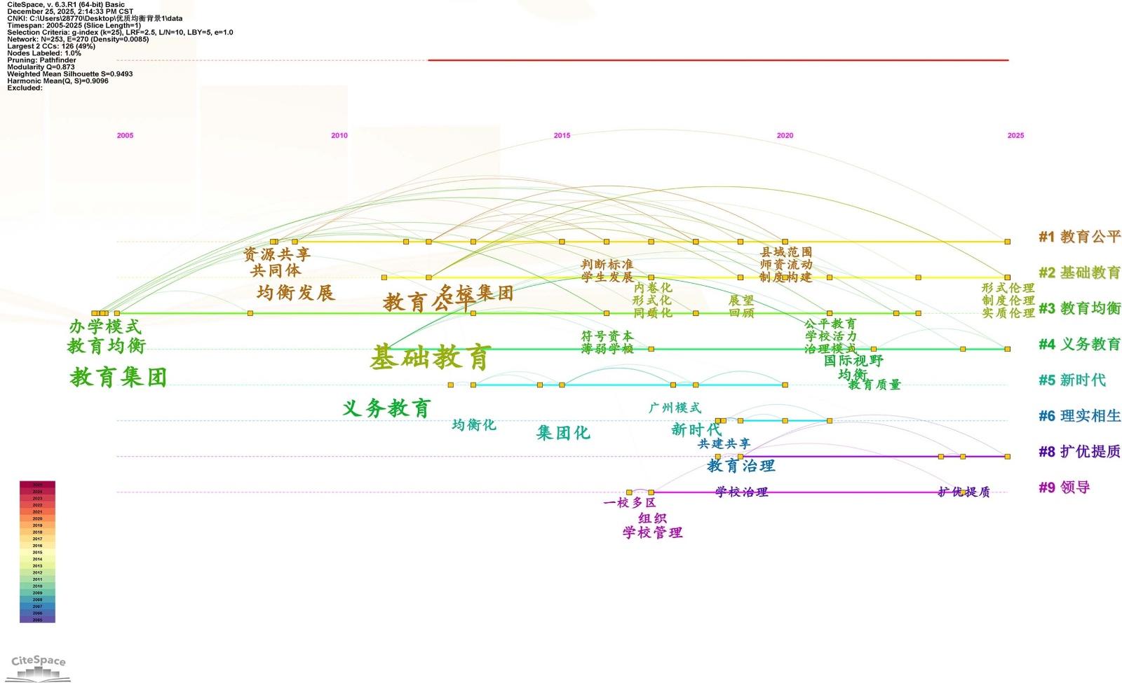 共词分析法是基于高频关键词的计量研究方法,通过提取文献数据库中具有学科代表性的高频主题词(频次超过设定阈值)进行分析[11]。本研究运用CiteSpace对2005~2025年我国集团化办学文献进行可视化分析,生成包含253个节点、270条连线和10个聚类模块的知识图谱。图谱显示,“基础教育”“优质均衡”“教育公平”“教育集团”等关键词节点显著,频次较高,表明这些议题构成当前研究热点领域,具有重要学术价值。
