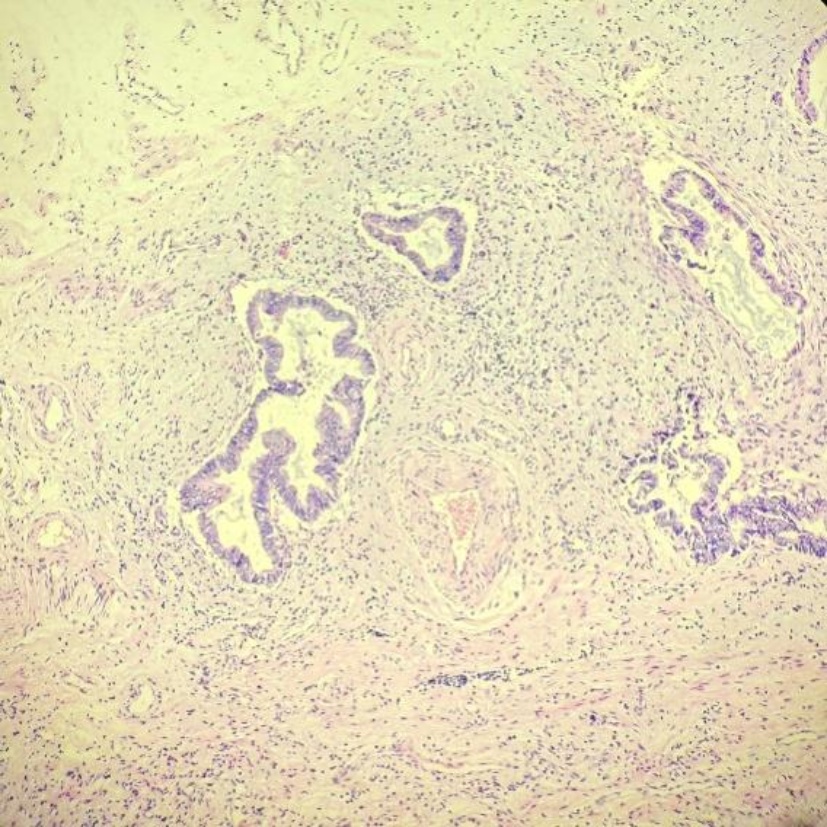 患者,女,56岁。2024年3月因“间断右下腹痛1月余”就医。患者1月余前无明显诱因开始出现右下腹痛,呈阵发性钝痛,无恶心、呕吐,无腹胀、腹泻,无畏寒、发热,无呕血、黑便,行B超示:右下腹阑尾区不均质低回声团,阑尾炎可能性大,给予对症抗感染治疗,症状有所缓解,但仍反复疼痛,为求进一步治疗收入当地医院。既往有高血压病史,16年前因肠套叠行结肠切除手术。查体:心肺检查未见明显异常,腹部平坦,无腹壁静脉曲张,腹部可见陈旧手术瘢痕,腹软,右下腹压痛,无反跳痛及肌紧张,腹部未触及明显肿块,叩诊呈清音,移动性浊音阴性,肠鸣音3次/分,未闻及血管杂音。入院后完善血常规:白细胞6.61*10^9/L (3.5~9.5)、消化系统肿瘤标记物:癌胚抗原2.4 ng/ml (13~150),甲胎蛋白3.87 ng/ml (≤7),类抗原19-9 31.9 ng/ml (≤34)均正常。腹部CT示:腹腔内部分小肠积液。右下腹局部见管状影,壁钙化。回盲部见多发微小结节,乙状结肠内见高密度灶(见图1(a)~(d))。肠镜示:回盲瓣呈唇状,阑尾肿大,开口处黏膜粗糙糜烂,蠕动可(见图2)。给予行腹腔镜下阑尾切除术,术中探查见:阑尾端侧与临近小肠致密黏连,无法分离,完整切除阑尾困难,为避免损伤黏连小肠,剪刀贴近黏连处将阑尾浆膜剪开,剥离阑尾,部分浆膜残留于小肠,距离阑尾根部0.5 cm结扎,切除阑尾。术后病理:送检破碎阑尾组织,部分管腔上皮呈高级别上皮内瘤变,少量破碎游离组织内见数个异型腺体浸润性生长,考虑癌变,高分化腺癌。组织碎,浸润层次不明确,阑尾肌层及浆膜层见多量无细胞黏液及炎症反应(见图3(a),图3(b))。患者术后5天顺利出院。